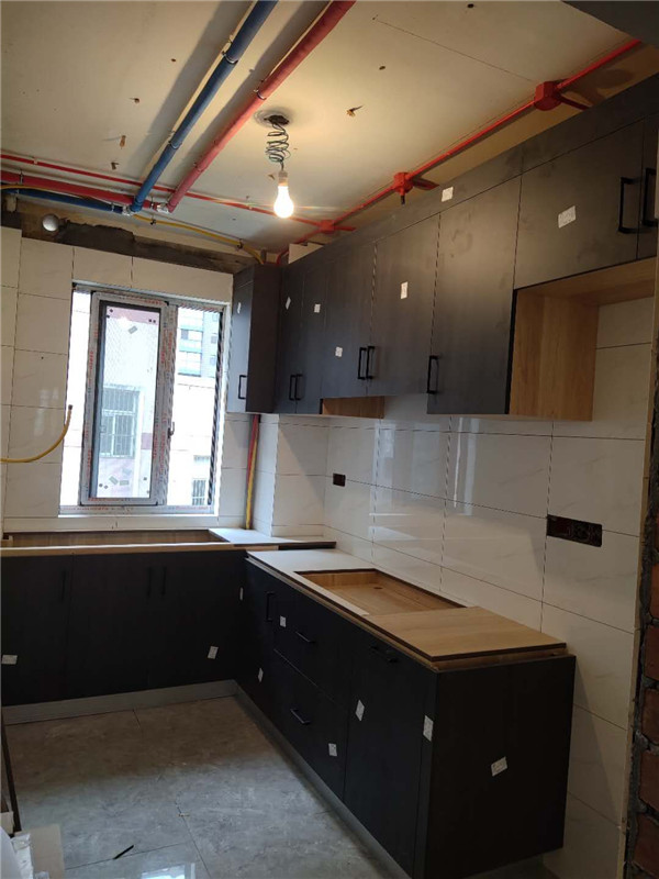 經過幾天的努力,柜子全部安裝完畢,有點家的味道了。客戶家除了廚房門板采用深色外,