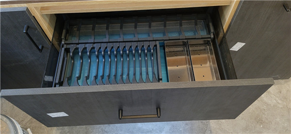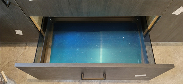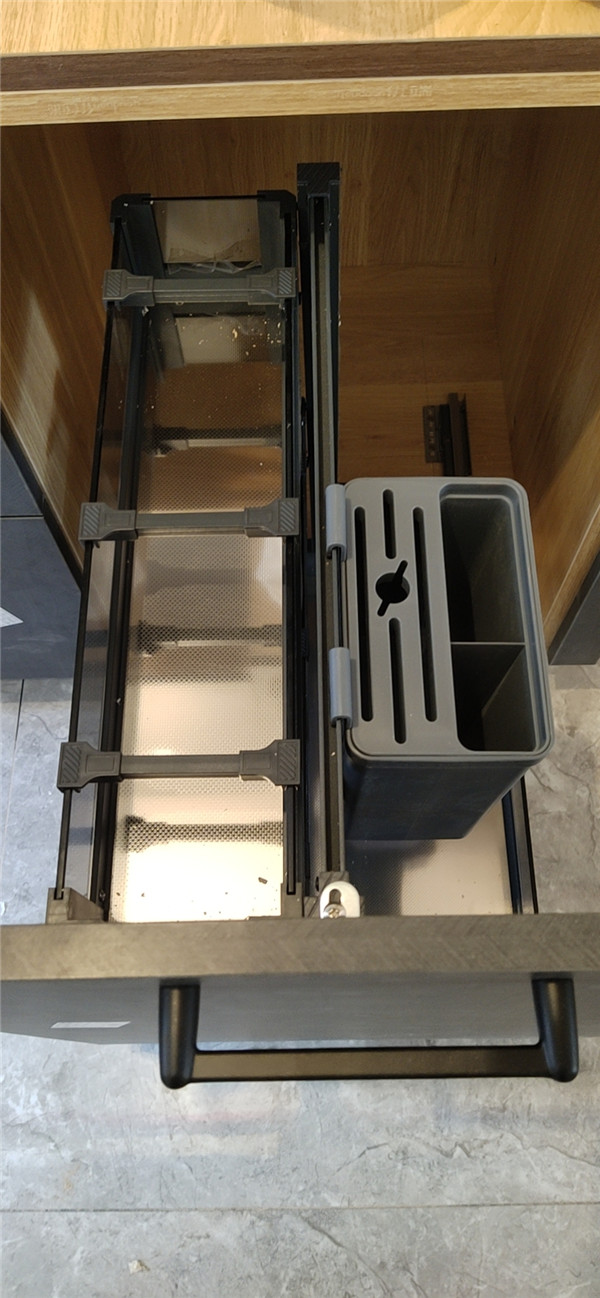 柜子內部細節不能忽視哦!防塵角,活動孔塞,水槽下面鋪有錫紙,統統都安排上。定制款拉籃三件套。