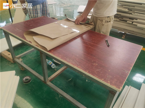 封邊完畢,已進入打包環節。柜門師傅會用柏油清洗劑全部擦拭一遍,以保證裝到客戶家整潔美觀。