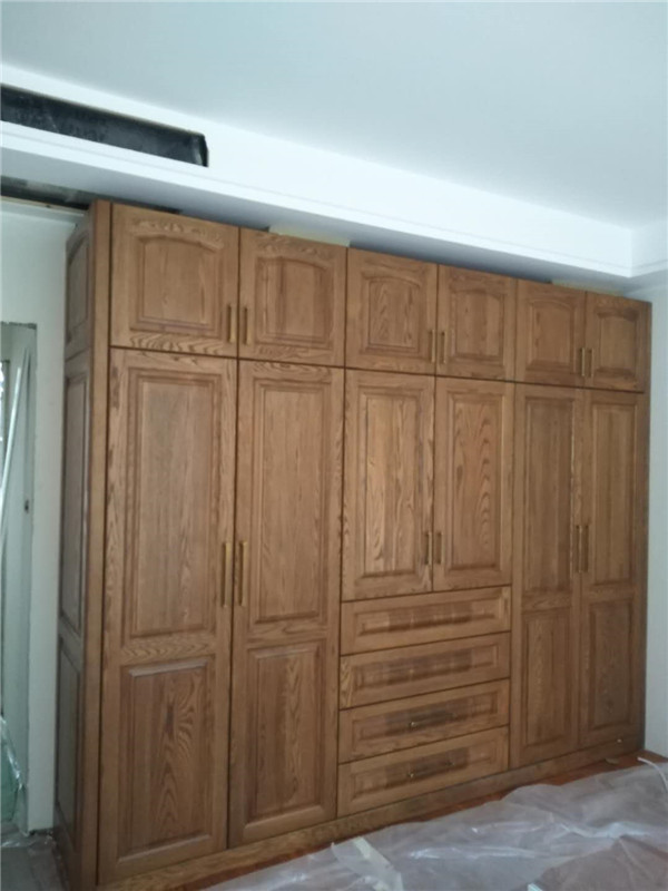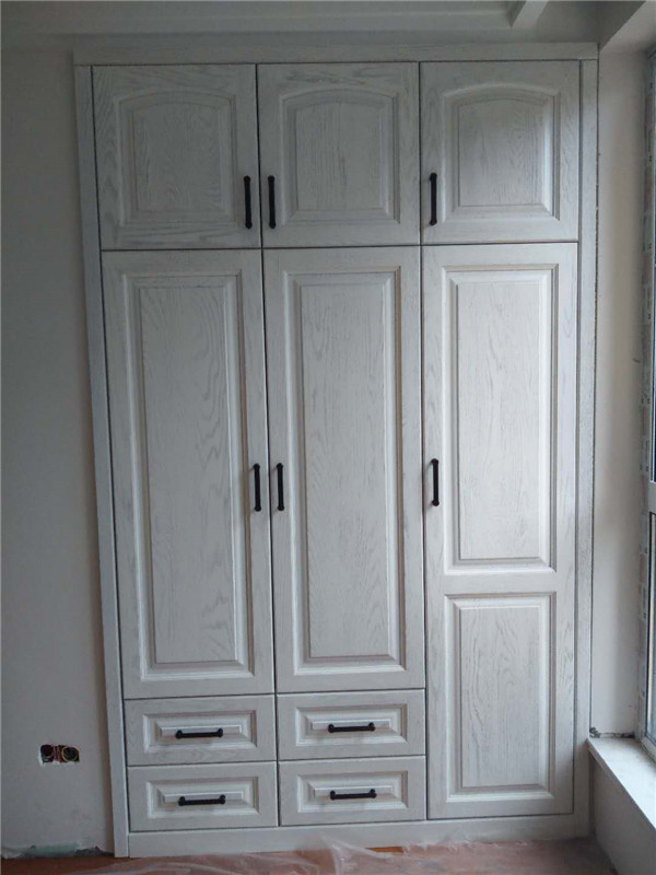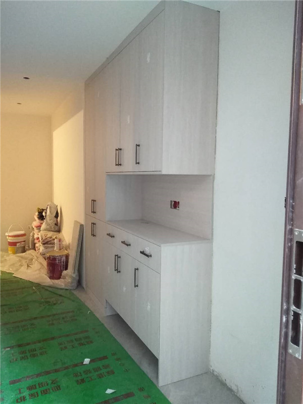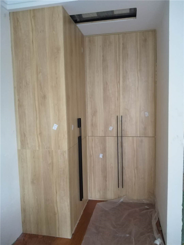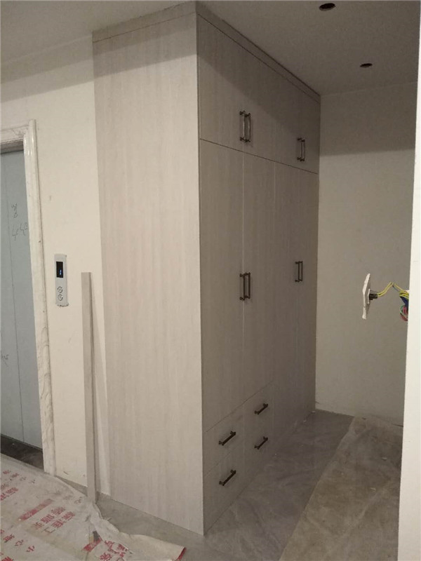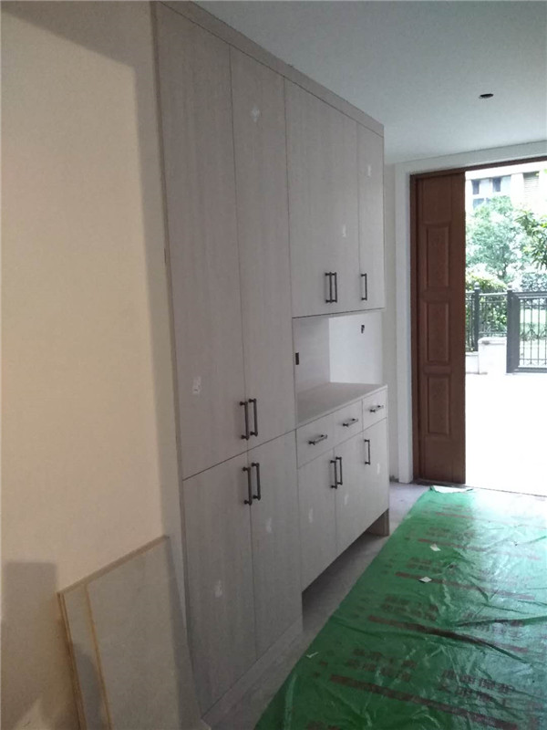 柜門安裝好了,柜門部分用了模壓門,還有部分用了雙飾面平板門,顏色淺的門配了黑色拉手,