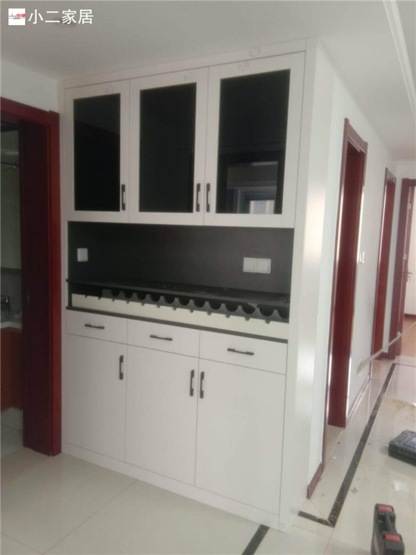 柜子安裝完畢了,深色柜體白色門板,金典、沉穩(wěn)。業(yè)主家餐邊柜上面設(shè)計(jì)成玻璃門
