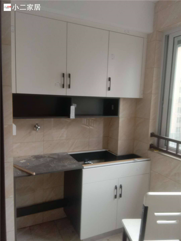 到的廚房水槽、灶具、浴柜臺(tái)盆放置在現(xiàn)場(chǎng),后期臺(tái)面安裝需用到。柜子安裝好后進(jìn)入臺(tái)面