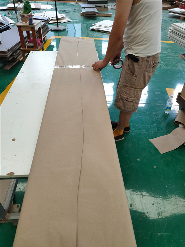 封邊完畢,已進入打包環節。師傅會用柏油清洗劑把板全部擦拭一遍,以保證裝到客戶家整潔美觀。