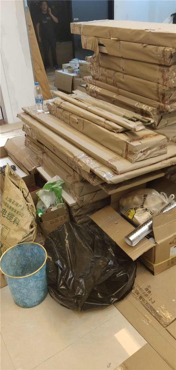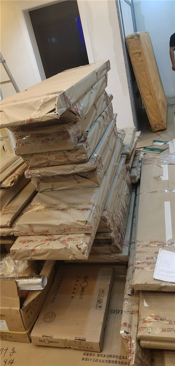 已進入打包環節。柜門師傅會用柏油清洗劑全部擦拭一遍,以保證裝到客戶家整潔美觀。我家柜子每塊板都是整個打包起來的,
