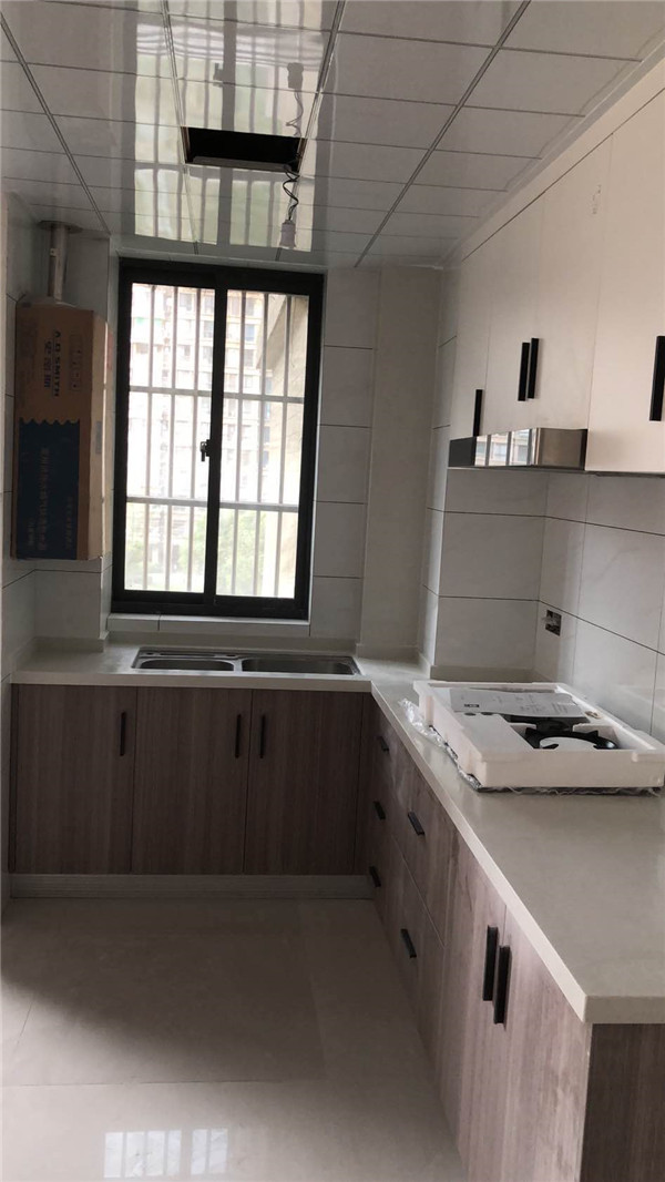 灶具、浴柜臺盆放置在現(xiàn)場,后期臺面安裝需用到。柜子安裝好后進入臺面測量環(huán)節(jié),