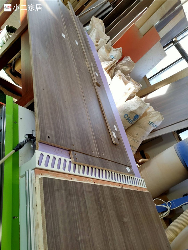 開始封邊啦,封邊采用的是1.0厚的pvc封邊條,方便前口倒圓弧,整體效果即美觀又不容易磕碰到。膠水采用美國波士熱熔顆粒膠,當(dāng)設(shè)備溫度達(dá)到180℃以上就好開始封邊了。我家不管大小板都是四面封邊哦!每塊板上都貼有小標(biāo)簽,方便后期安裝師傅安裝。