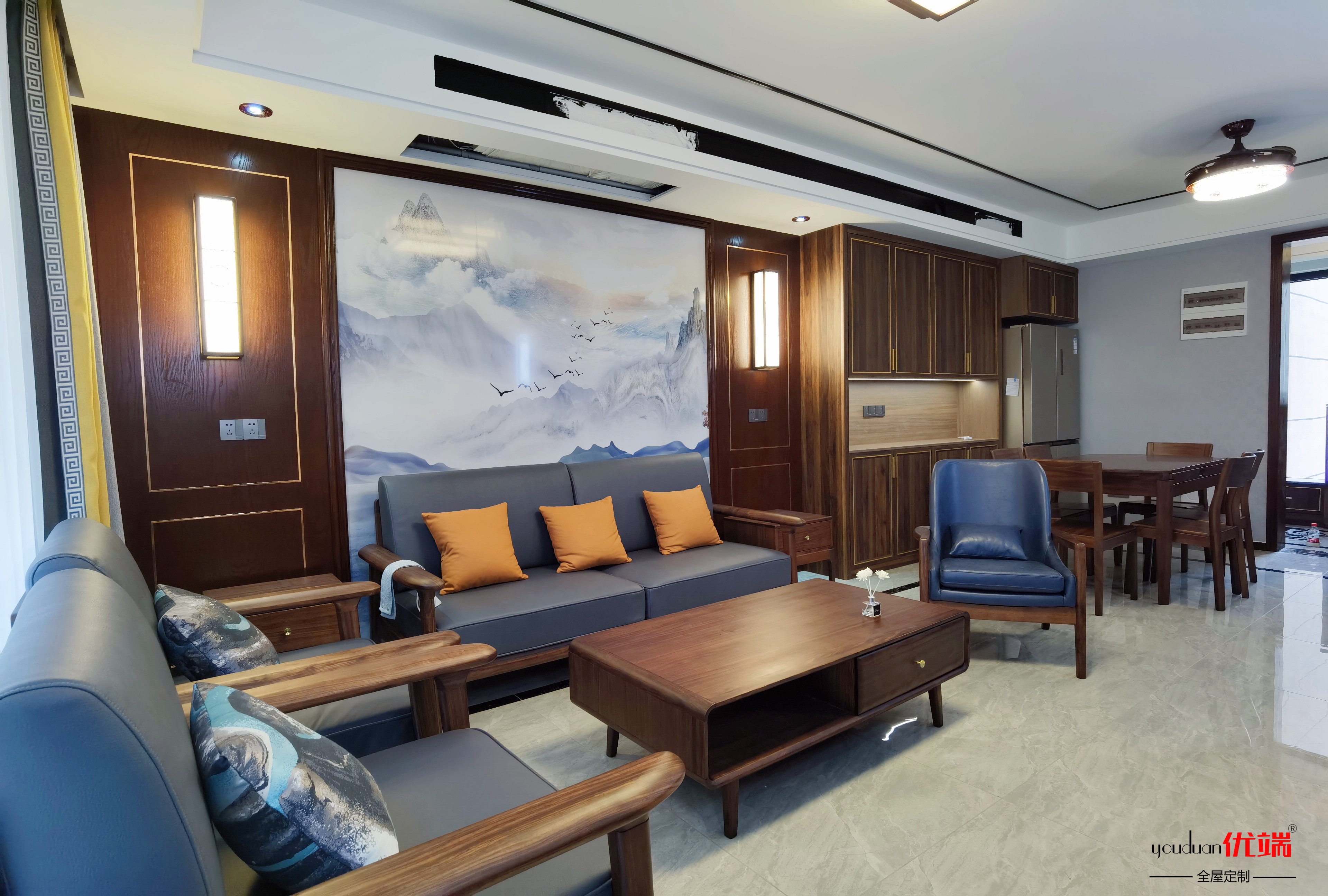 整體色調運用新中式實木包覆門夏特胡桃色進行搭配,結合石材電視背景山水畫營造寫意感,意境深遠。讓整個空間呈現典雅尊貴,又有時尚優雅的格調。