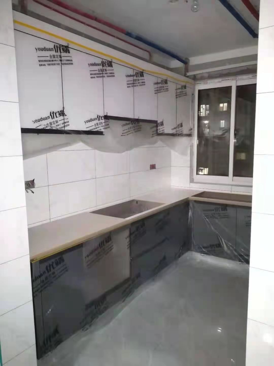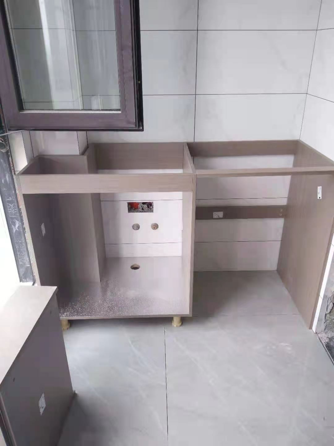 貨已安全送到客戶家了,安裝階段請您把您家需要用到的廚房水槽、灶具、浴柜臺盆放置在現場,后期臺面安裝需用到。柜子安裝好后進入臺面測量環節,臺面量完后一個星期內送貨并安裝。