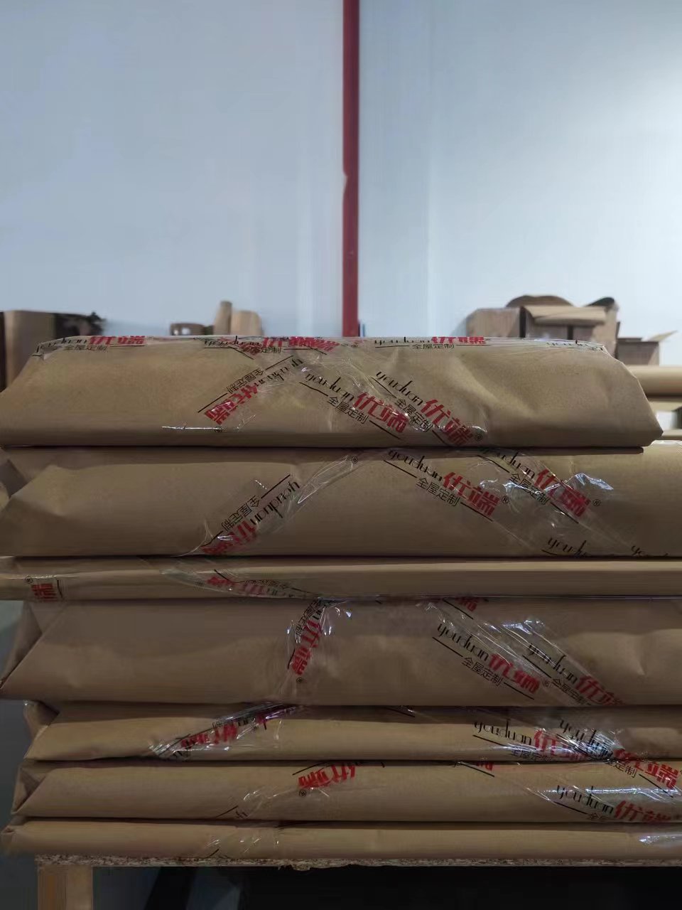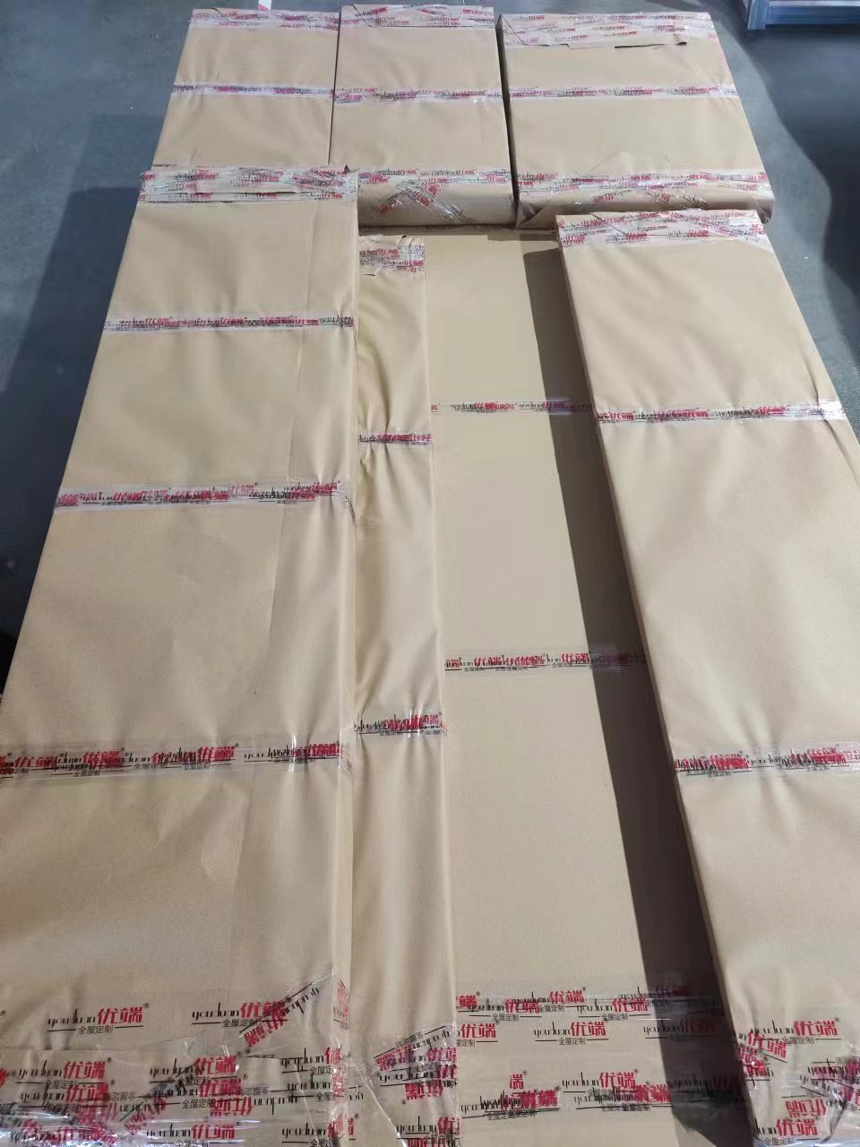 進(jìn)入打包環(huán)節(jié),我家柜子每塊板都是整個(gè)打包起來的,以防運(yùn)輸過程中劃傷或者磕碰到,跟板材下面墊板一個(gè)原理哦!全部打包好就可以聯(lián)系客戶送貨咯!