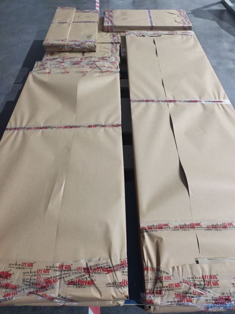 進(jìn)入打包環(huán)節(jié),我家柜子每塊板都是整個(gè)打包起來(lái)的,以防運(yùn)輸過(guò)程中劃傷或者磕碰到,跟板材下面墊板一個(gè)原理哦!重新訂板會(huì)存在色差,這是重點(diǎn),圈起來(lái)必考。全部打包好就可以聯(lián)系客戶送貨咯!