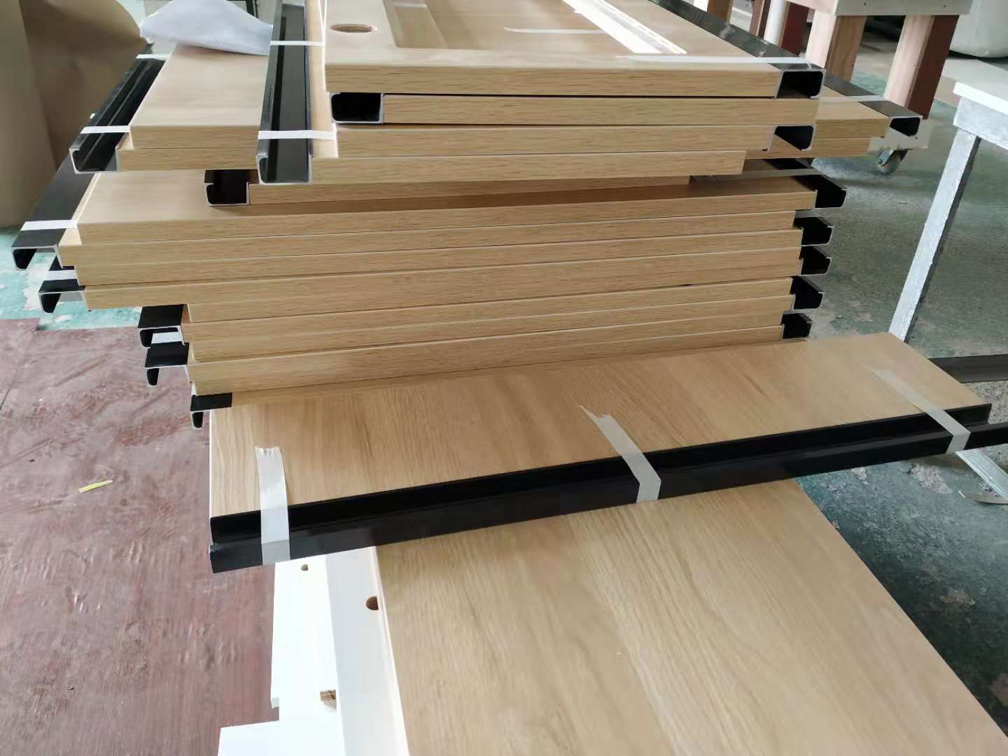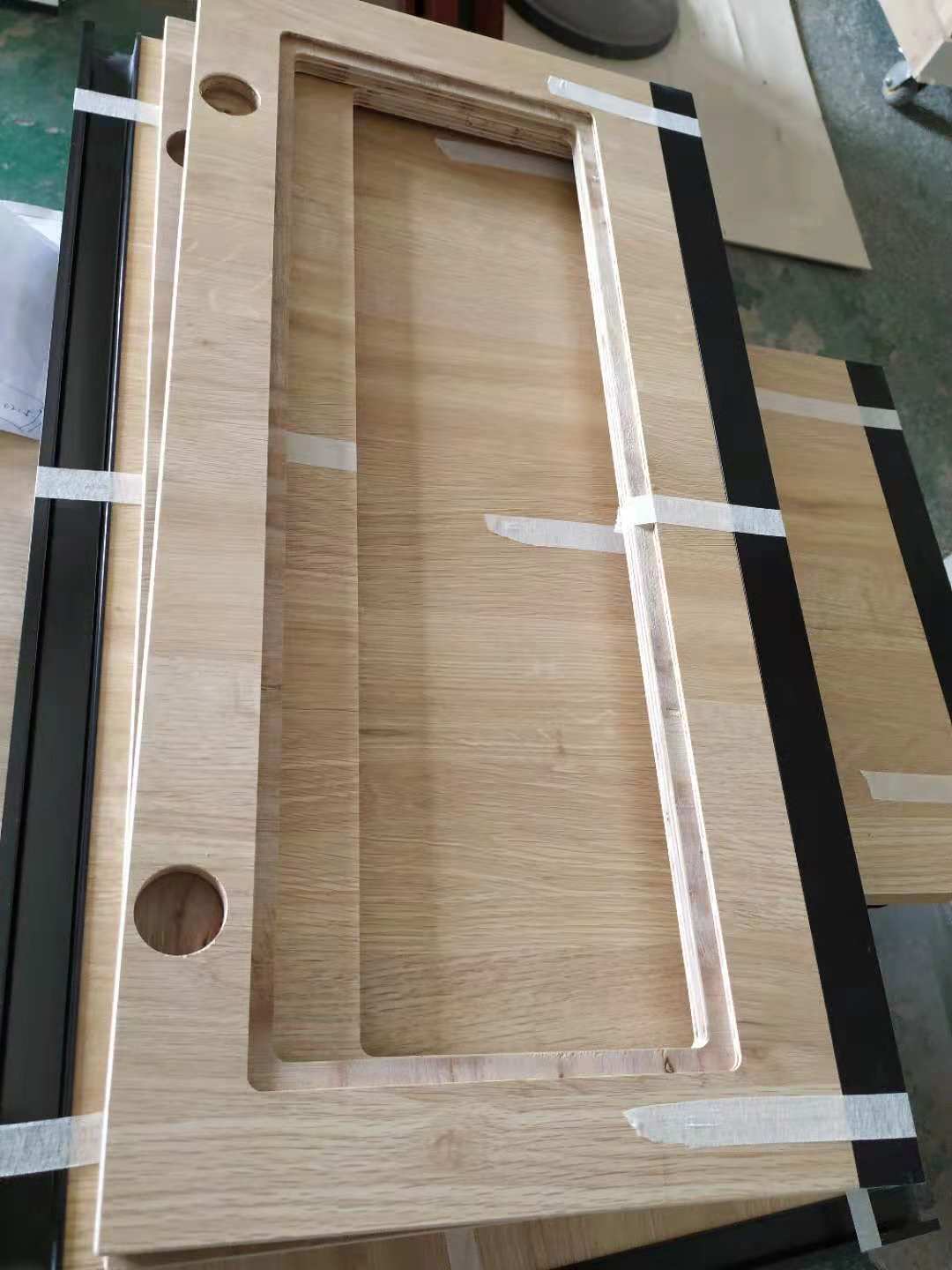 門板板材已經(jīng)打好孔啦,板材使用平安樹7清水橡木色實(shí)木多層板制作,黑色的是鑲嵌的門板拉手,打的大孔是用來安裝鉸鏈的