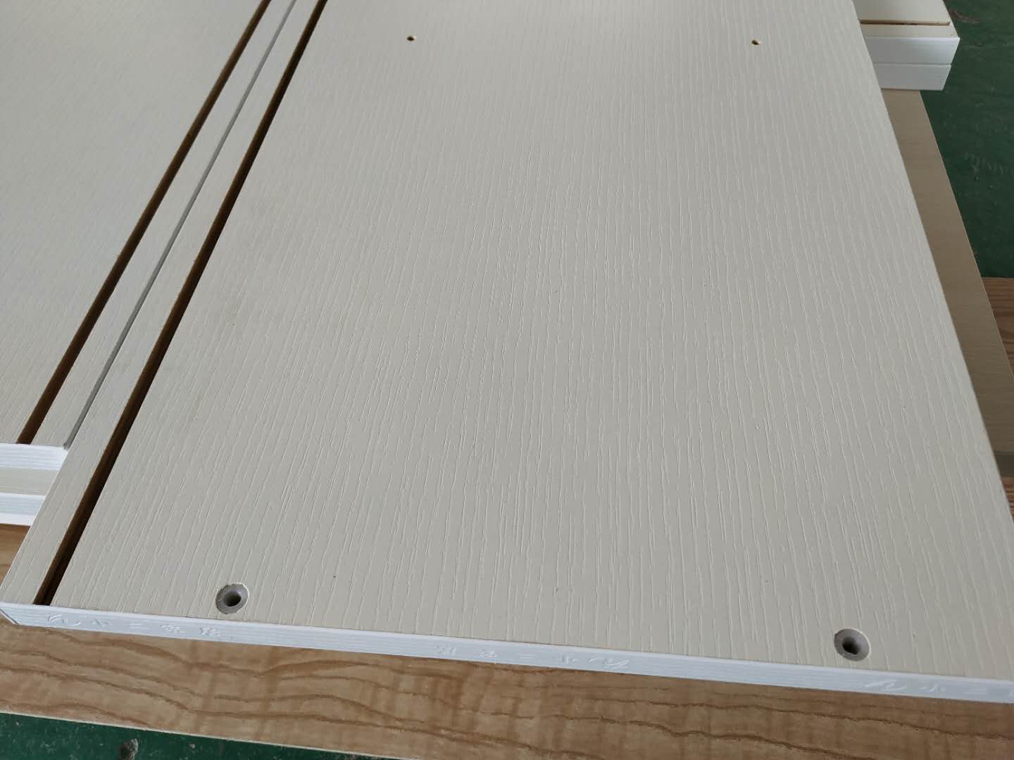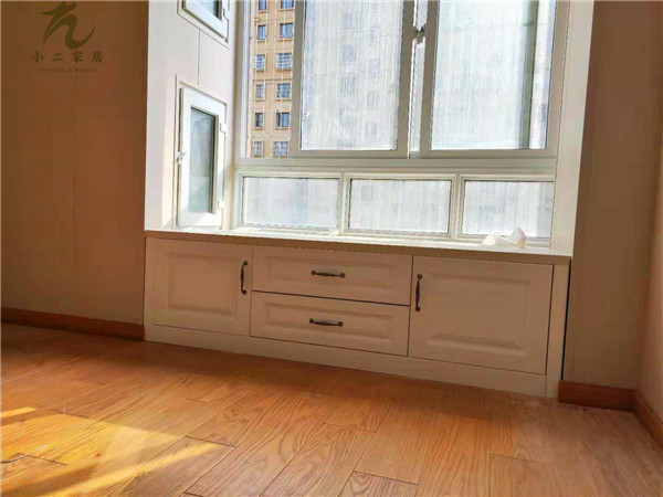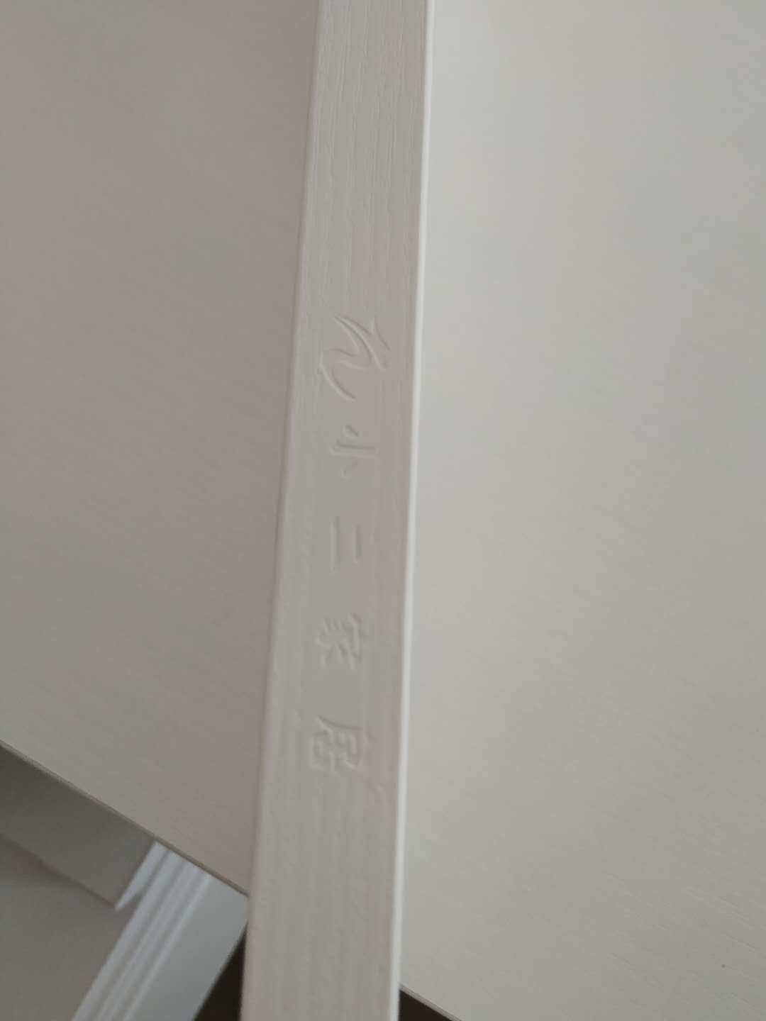 開始制作!衣柜板和飄窗板使用平安樹暖白色實木多層板制作,封邊完畢,封邊條上印有小二家居的logo,衣柜板打孔中。