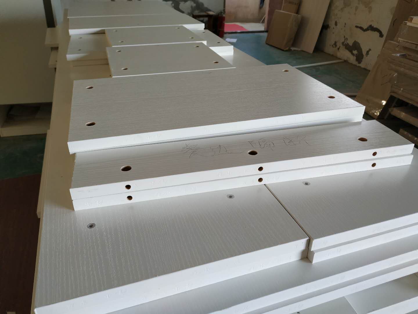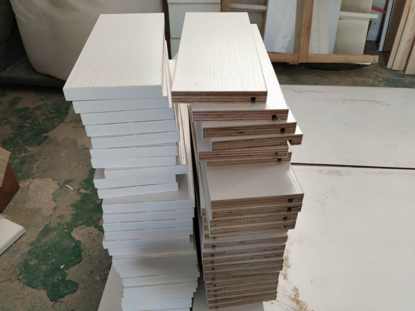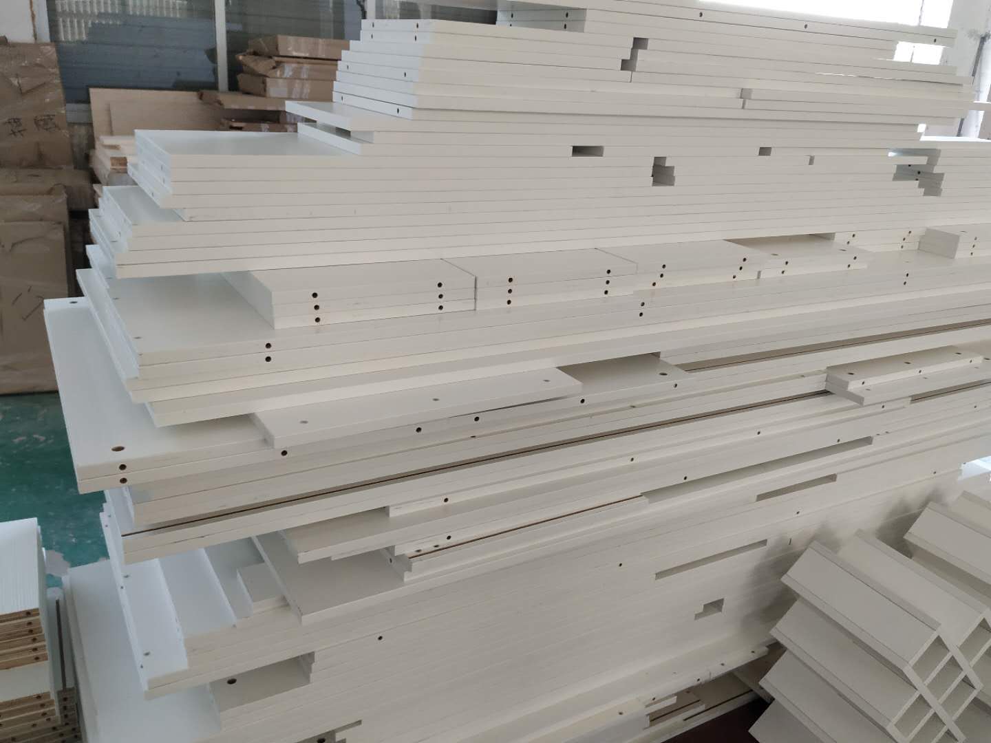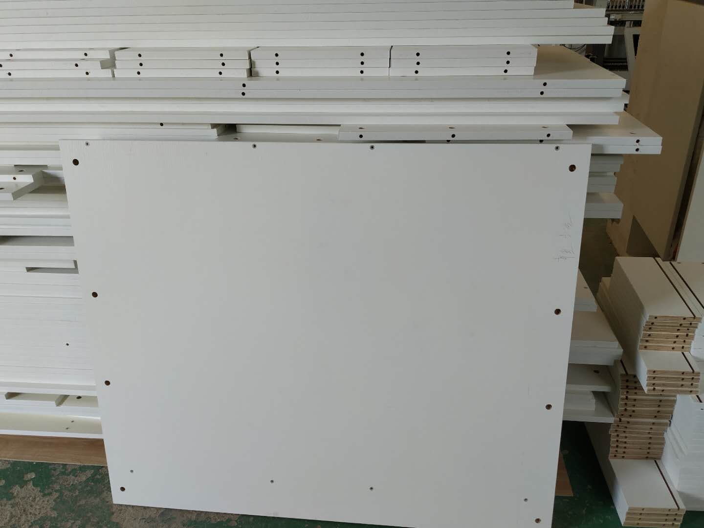 餐邊隔斷板打空中,圖5是待封邊的抽屜板,依然使用平安樹暖白色實木多層板制作,木板上有平安樹高級藍光防偽標志。