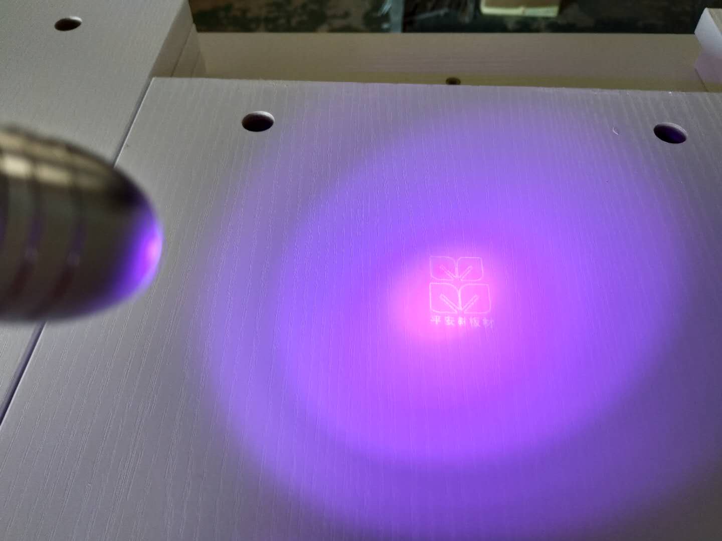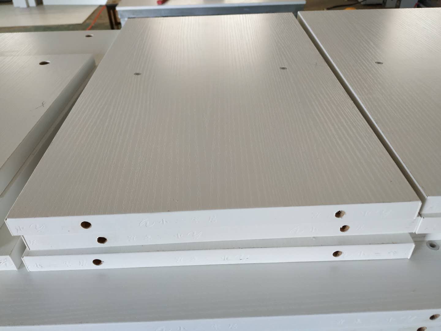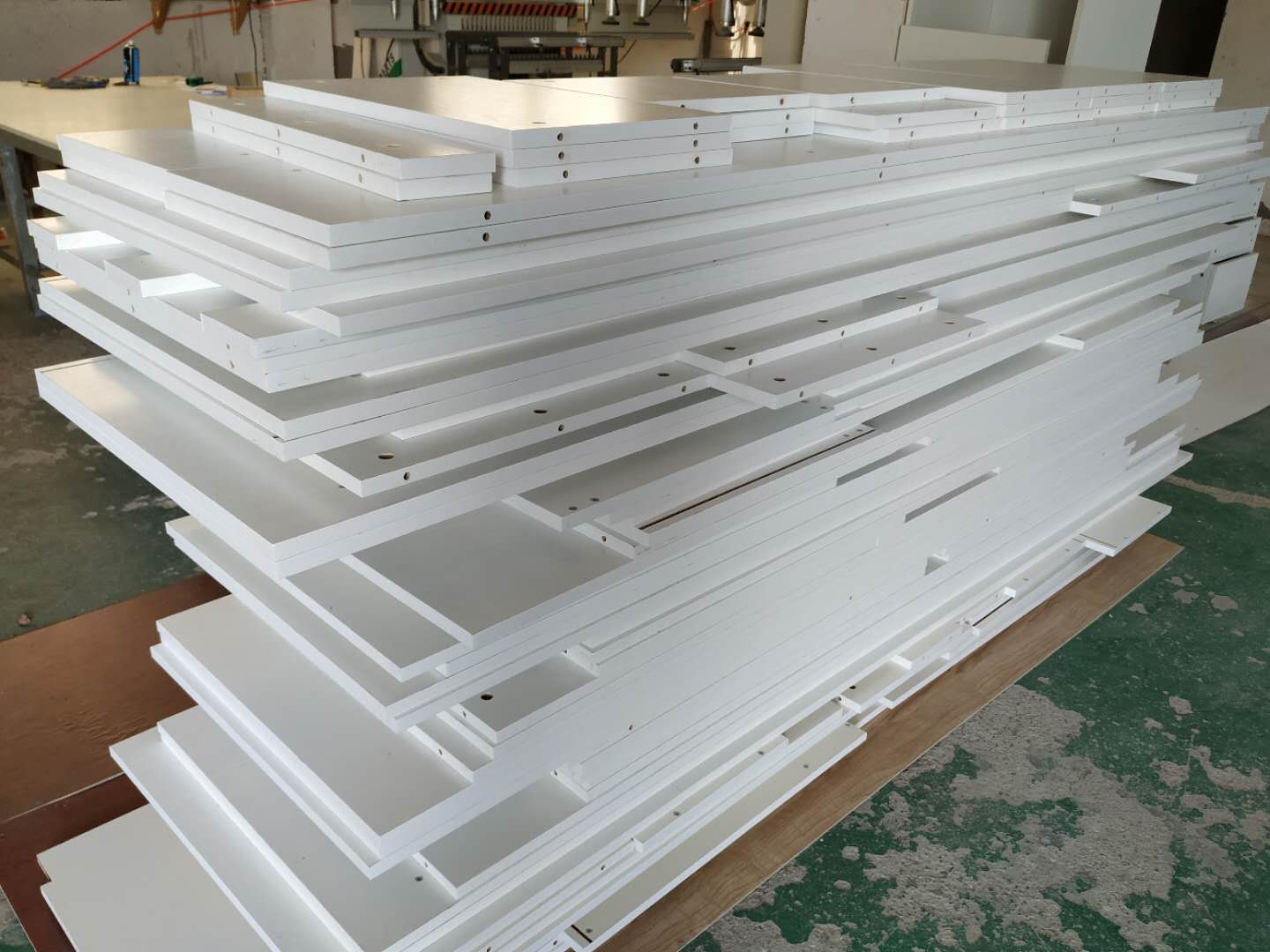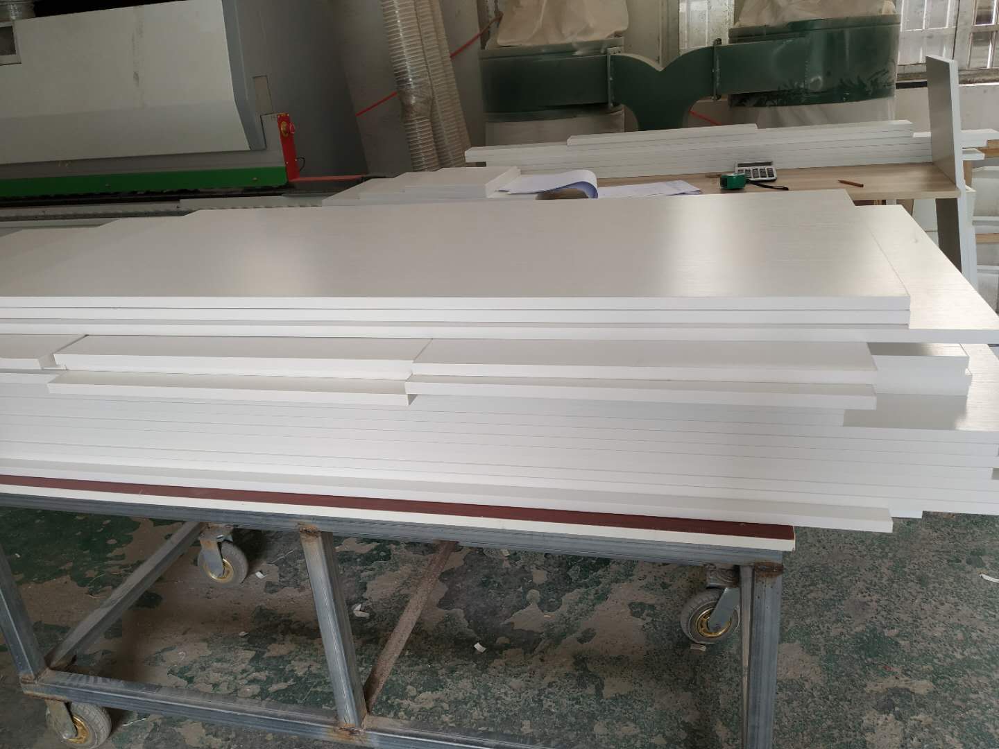 餐邊隔斷板打空中,圖5是待封邊的抽屜板,依然使用平安樹暖白色實木多層板制作,木板上有平安樹高級藍光防偽標志。
