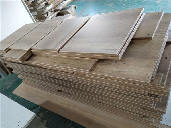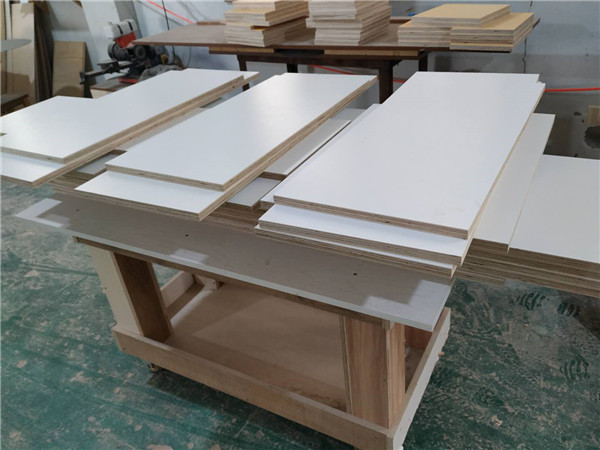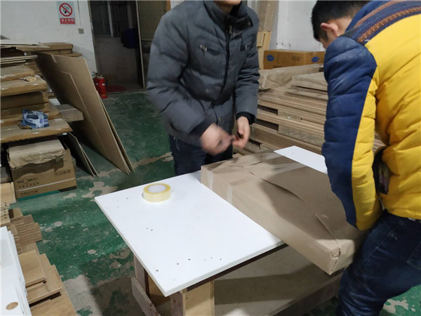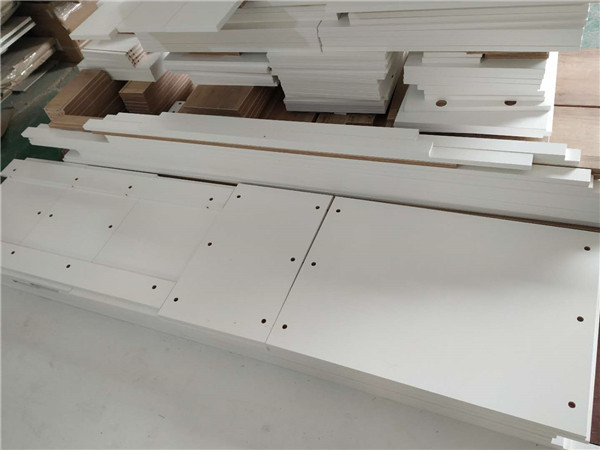 仿古布紋色的柜體板材已經打包好啦,暖白色的柜門板材也已經打好孔了,大圓孔是用來裝鉸鏈的,其他板材也做得差不多啦