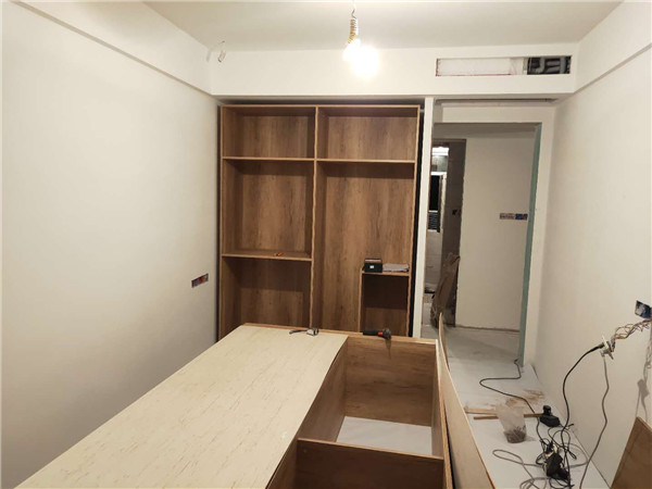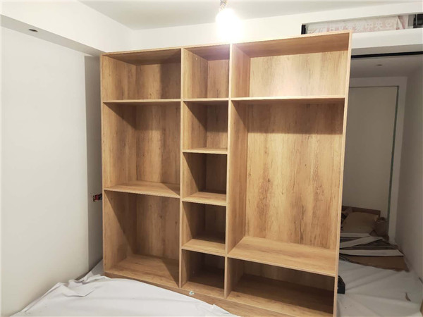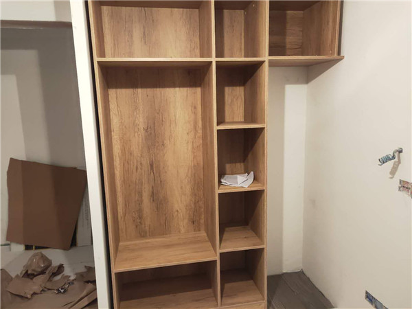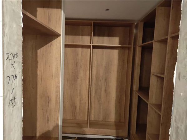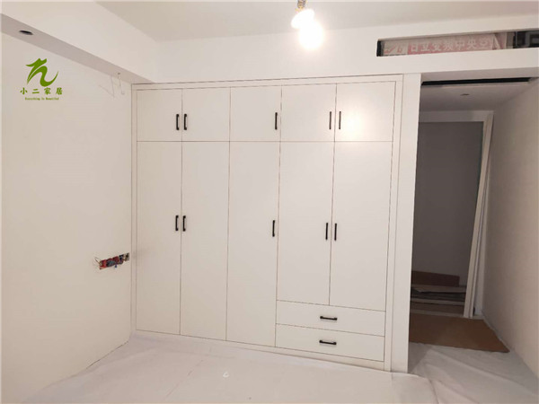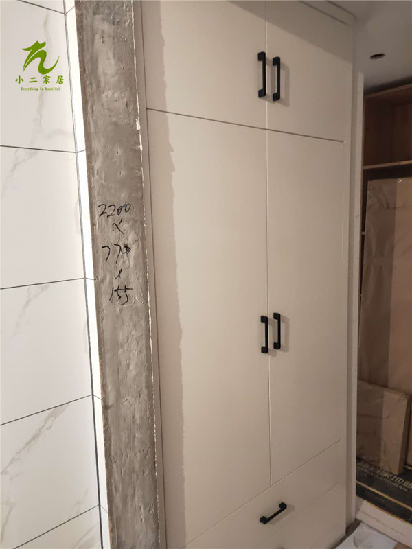 衣柜,衣帽間,餐邊柜和陽臺吊柜的柜體板材已經封好邊,打好孔啦,封邊條上印有小二家居的logo。