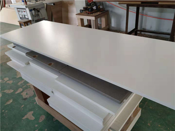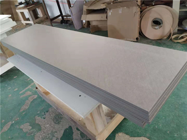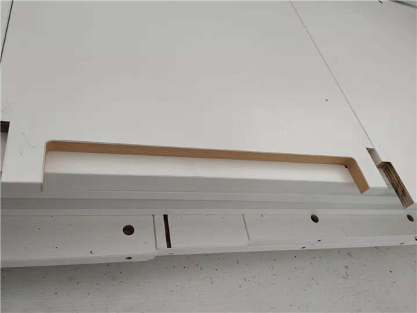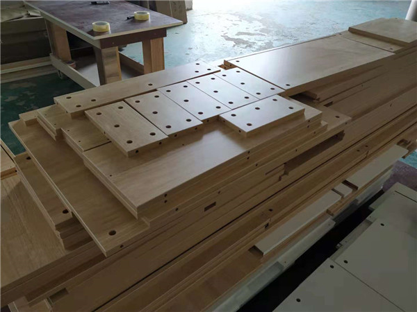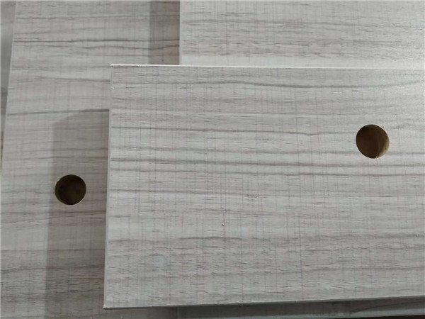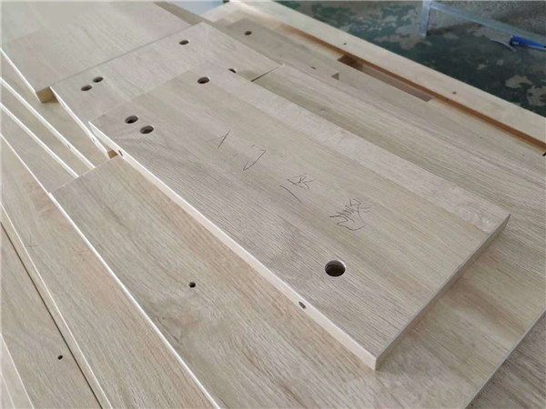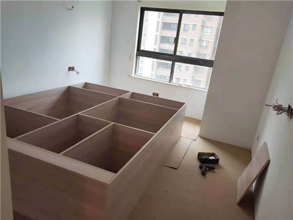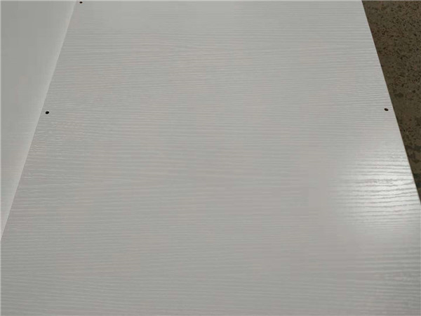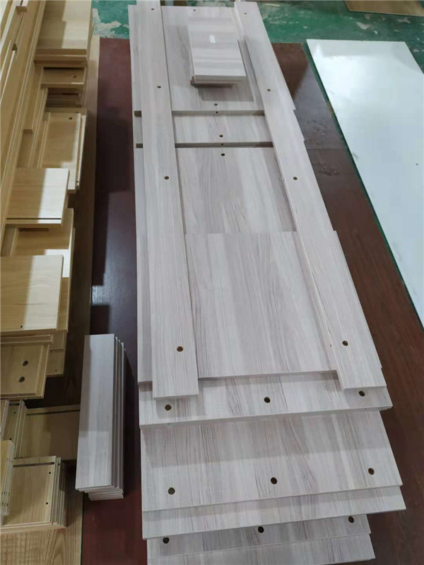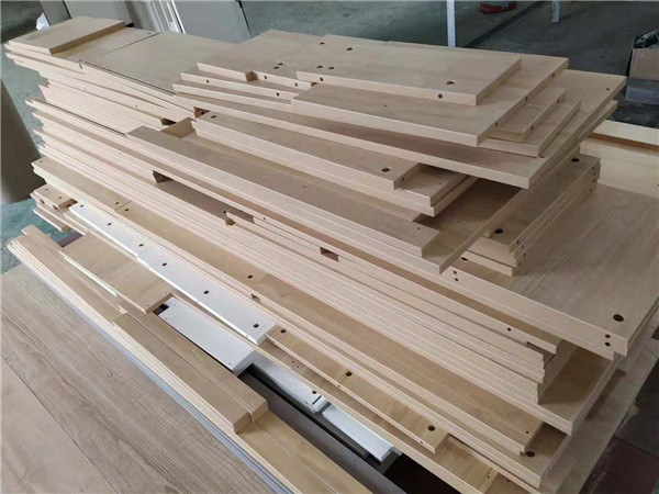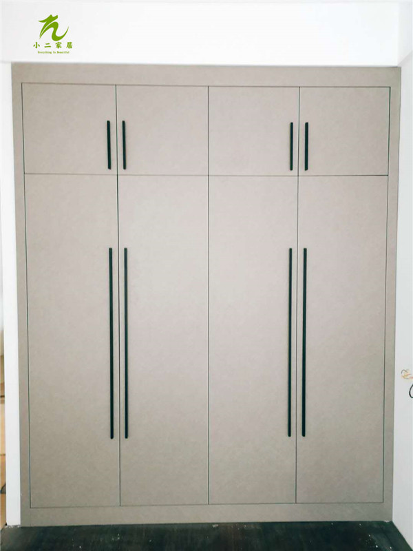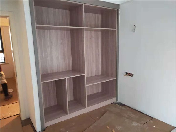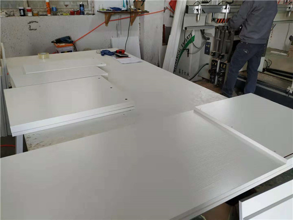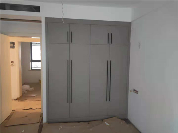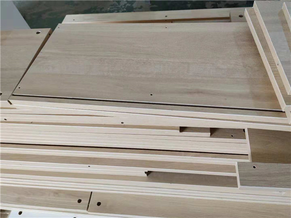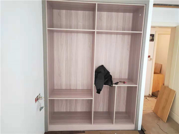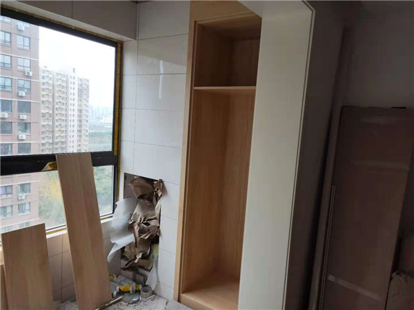圖中板材是主次臥衣柜和陽臺洗衣柜等的門板,板材使用平安樹印象布紋色實木多層板制作,