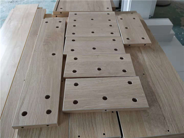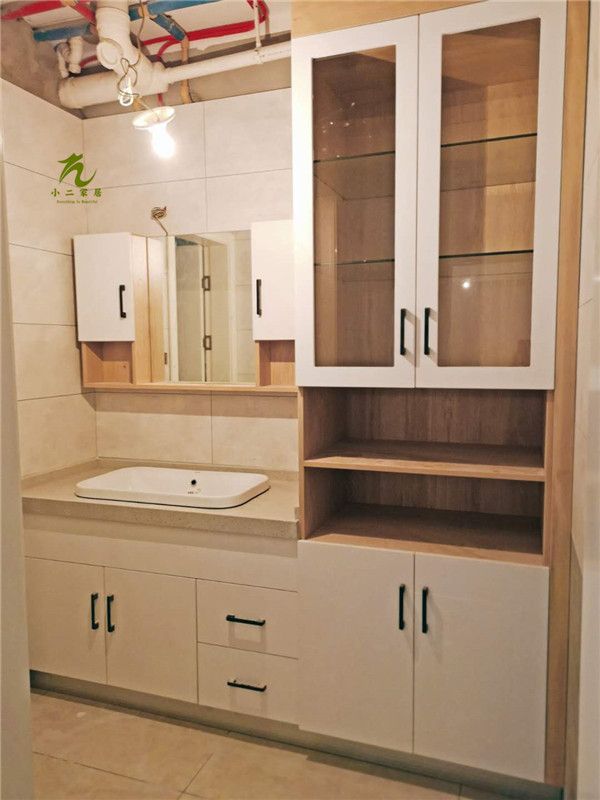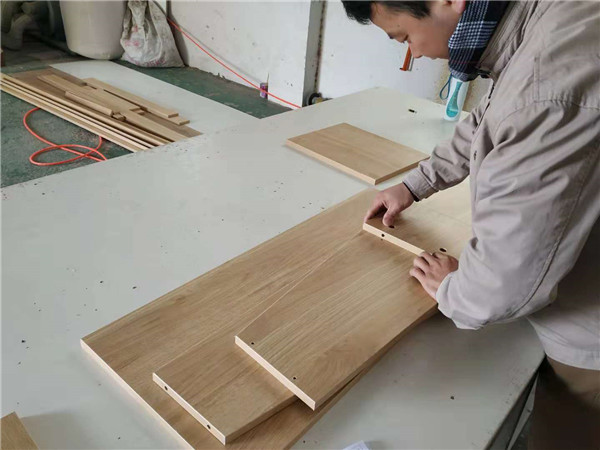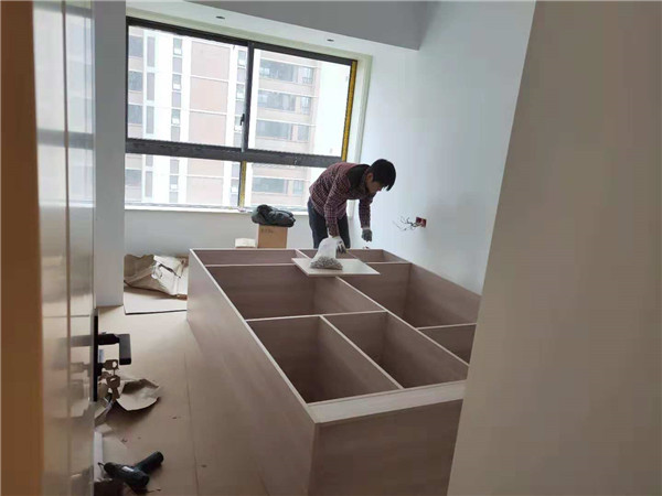 主次臥浴柜打孔中,柜體板材使用平安樹步步高升色實木多層板制作,柜門使用印象布紋色實木多層板制作。