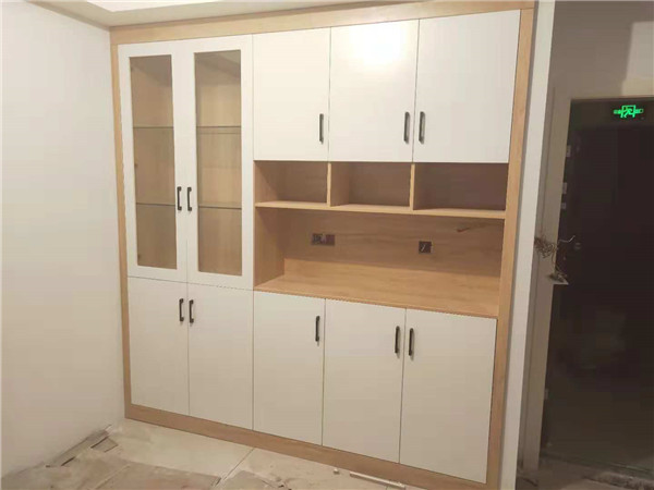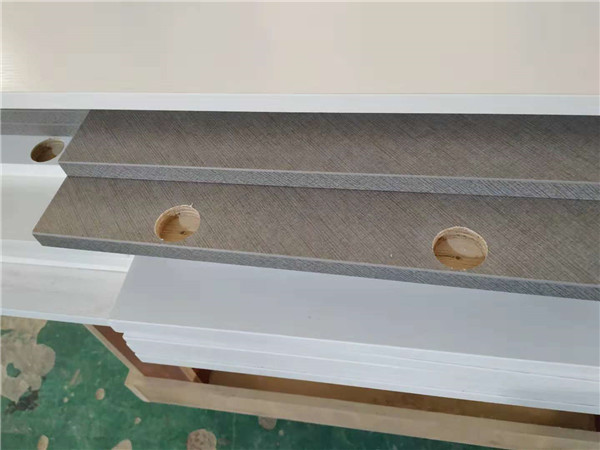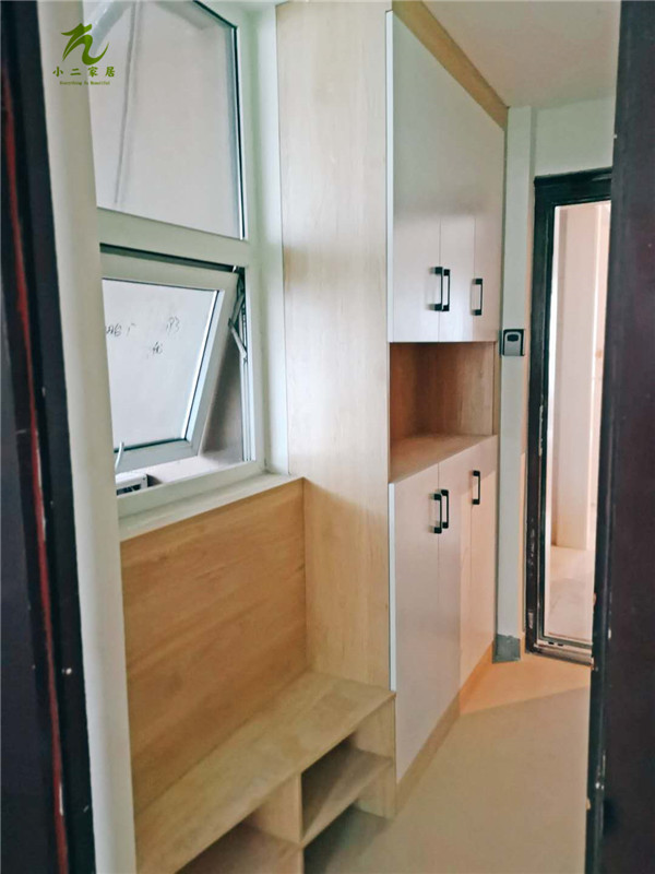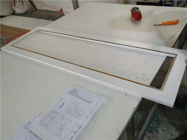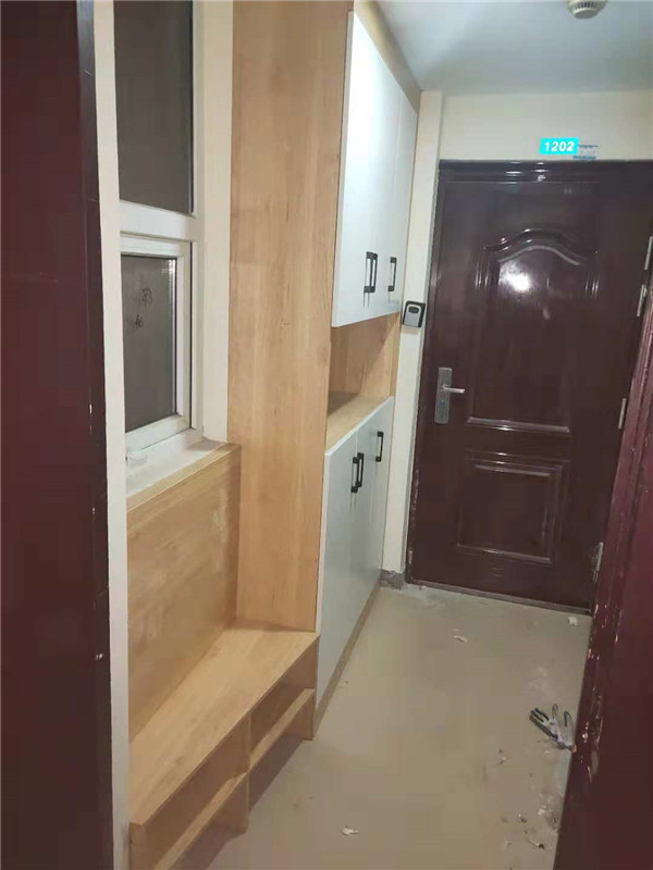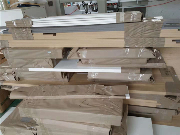 入門坐凳櫥柜吊柜等柜體板材已打好孔,玻璃窗框封邊中。