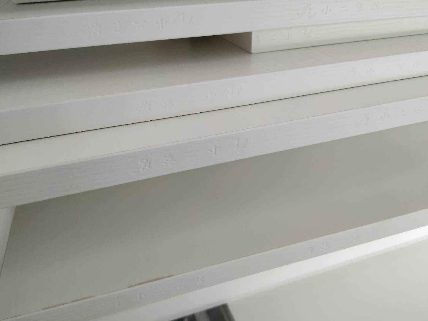 櫥柜板裁板封邊中,采用平安樹暖白色實木多層板制作!有高級藍光防偽標志!封邊完的板,封邊條上印有小二家居的logo~