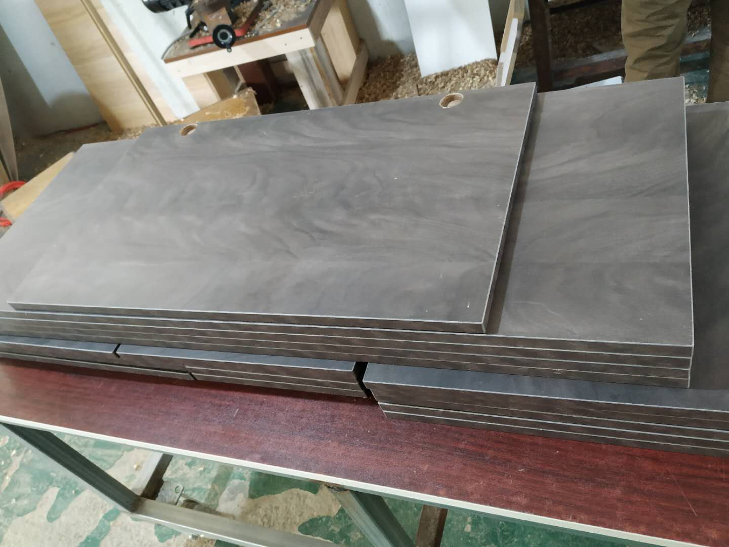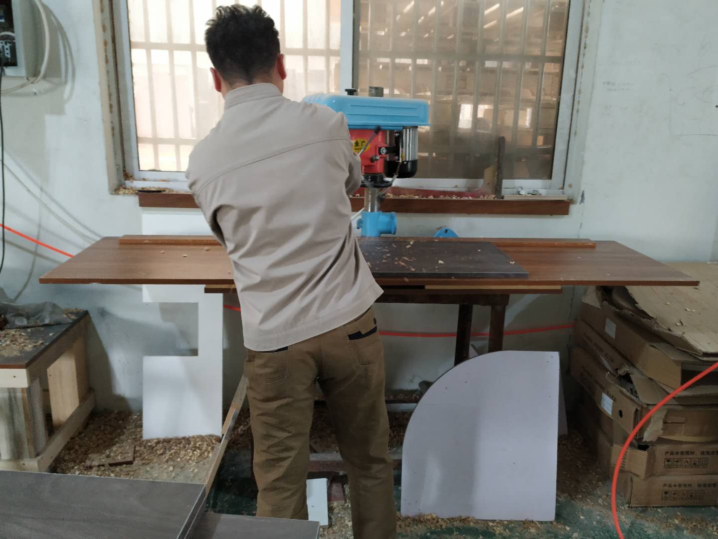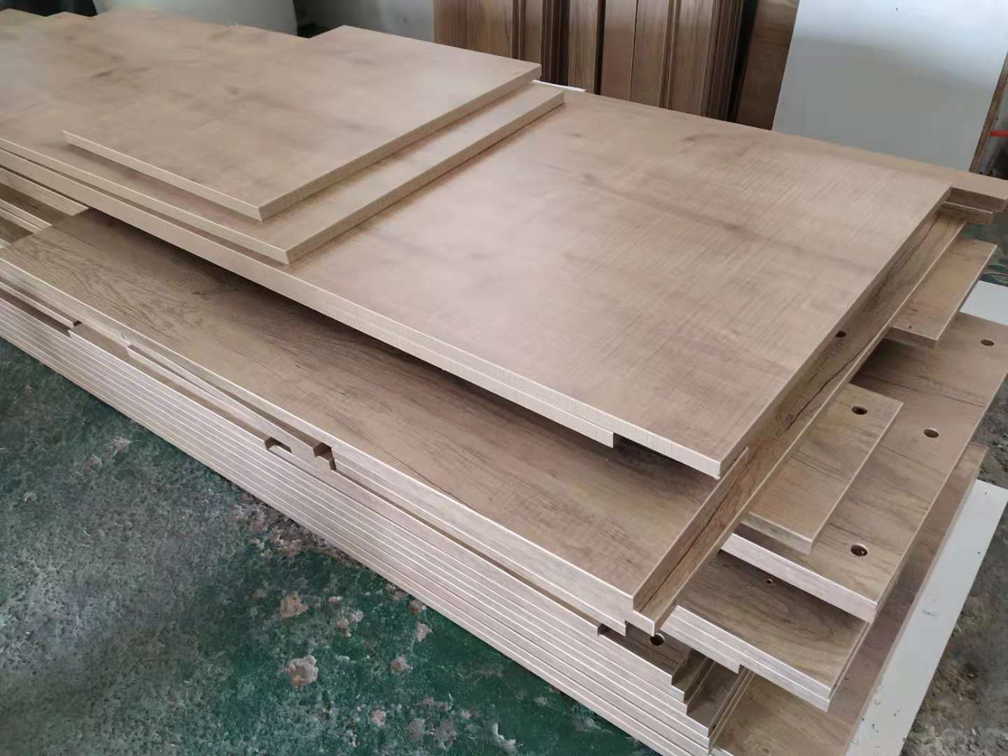隔斷柜板材制作打孔中,已經封好邊啦,封邊條上印有小二家居的logo!