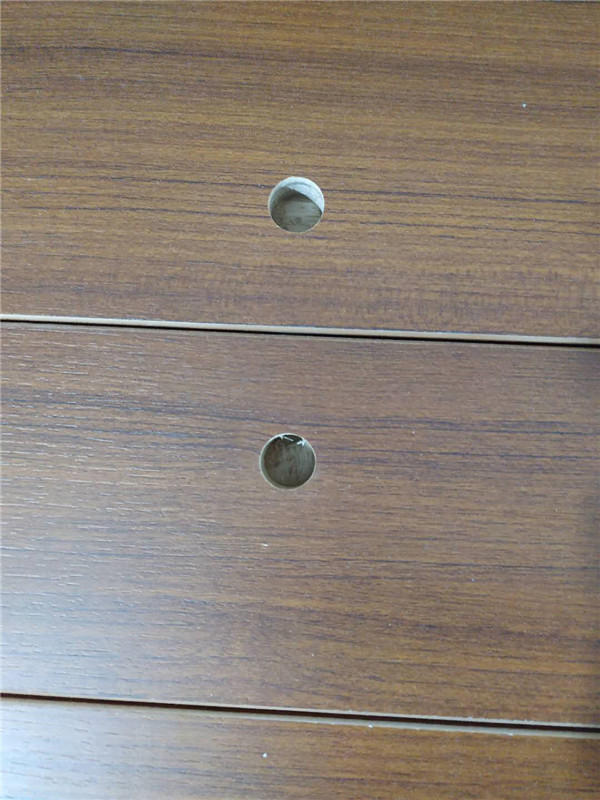 門板板材的鉸鏈孔是師傅用機器手工打洞的,后期還會經過一次修邊。銀沙榆色的櫥柜板材已經封好邊啦~今天也會打孔啦~