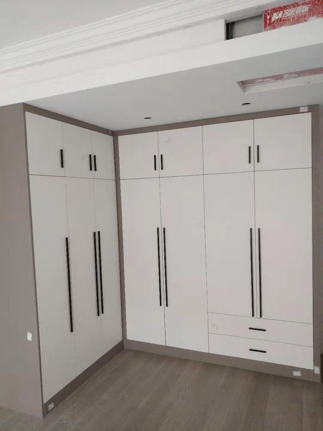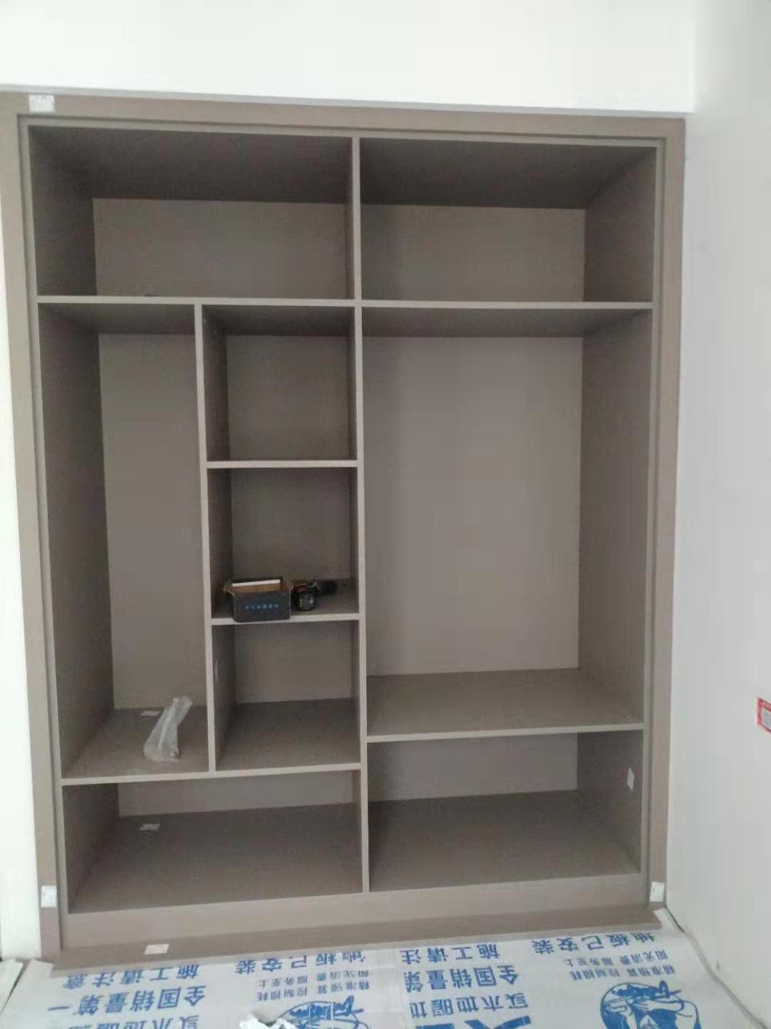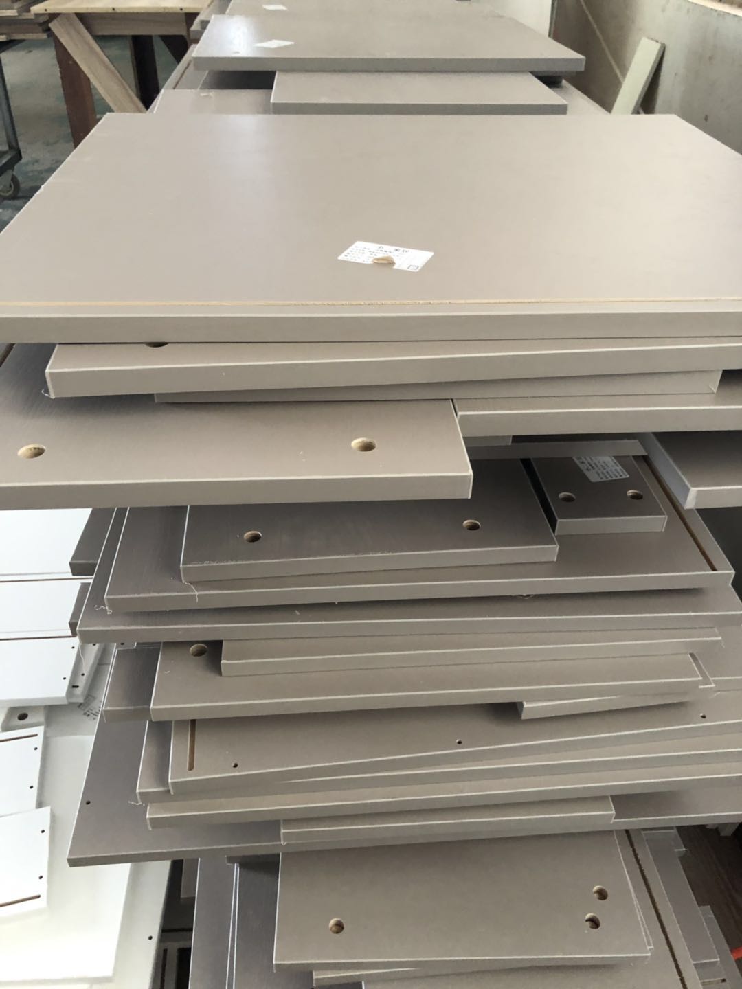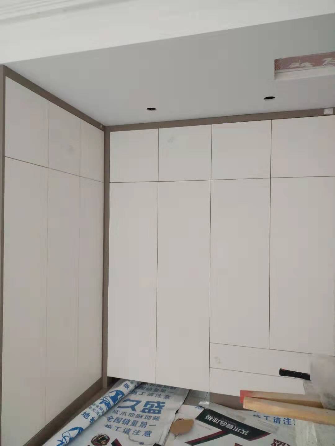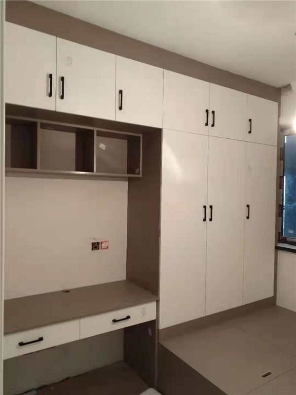 衣柜開板了,板材使用平安樹實木多層進口暖白制作,真材實料,有高級的藍光防偽標識,圖4-6是榻榻米鞋柜書桌等柜體板,板材使用金蘋果時尚灰制作。