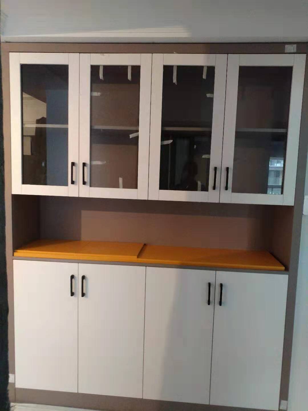 封邊中,采用法國波士熱熔膠顆粒,設備溫度達到200°C封出來的邊牢固,沒有爆邊~暖白色的柜體已經封好邊了