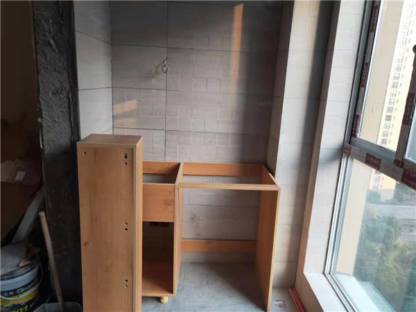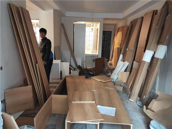 開始制作啦,衣柜榻榻米和廚房的板材封邊中,板材使用平安樹實木多層板制作,封邊條上印有小二家居的logo!