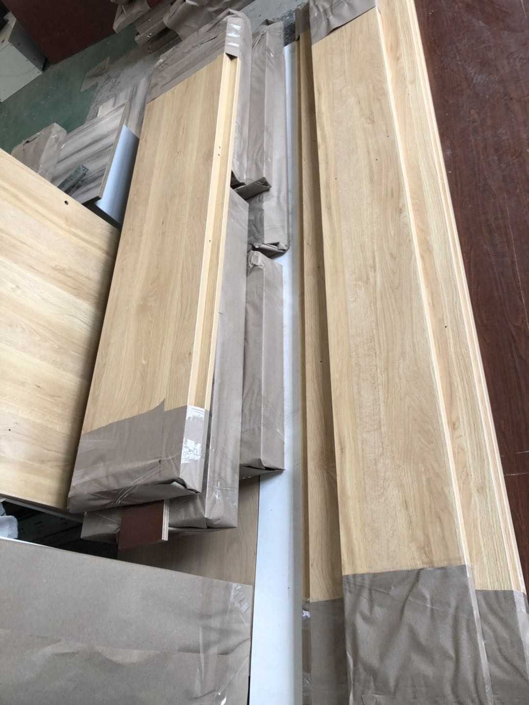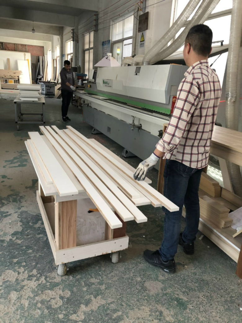 開始封邊了,專業設備封邊,沒有爆邊!使用進口波士熱熔顆粒膠封邊,機器設備到達200℃開始封邊!滾輪傳送帶可調節,方便運輸不同大小板材。