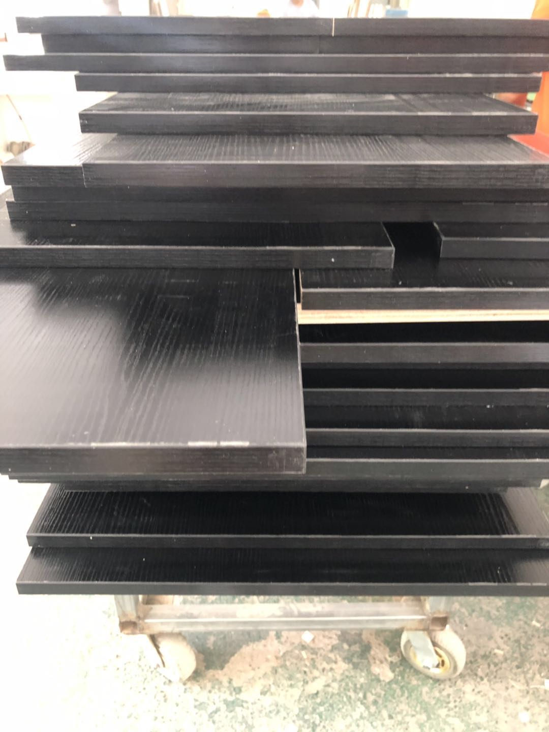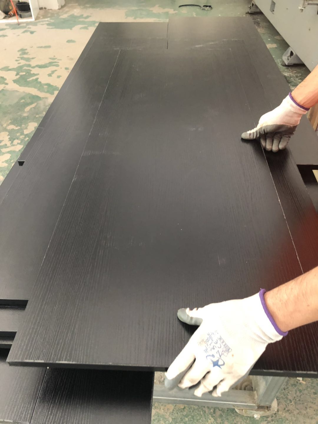 開始制作了,衣柜裁板中,板材使用平安樹白色實木多層板制作,有高級的藍光防偽標識哦,圖4到圖9是衣帽間的柜體板封邊中,使用黑色平安樹實木多層板制作,采用法國波士熱熔顆粒膠,設備封邊溫度達到200°C封出來的邊牢固,沒有爆邊~
