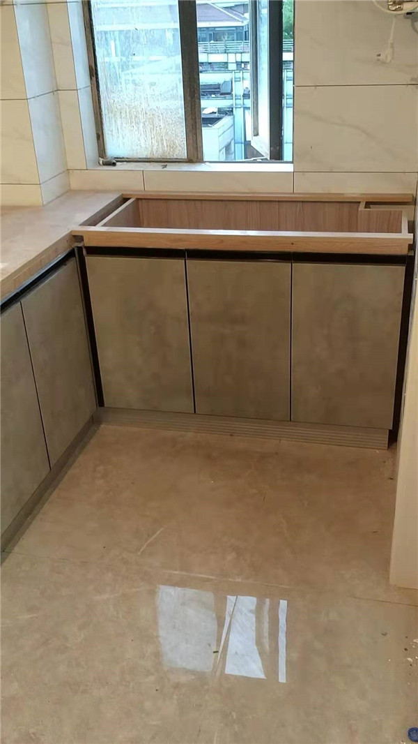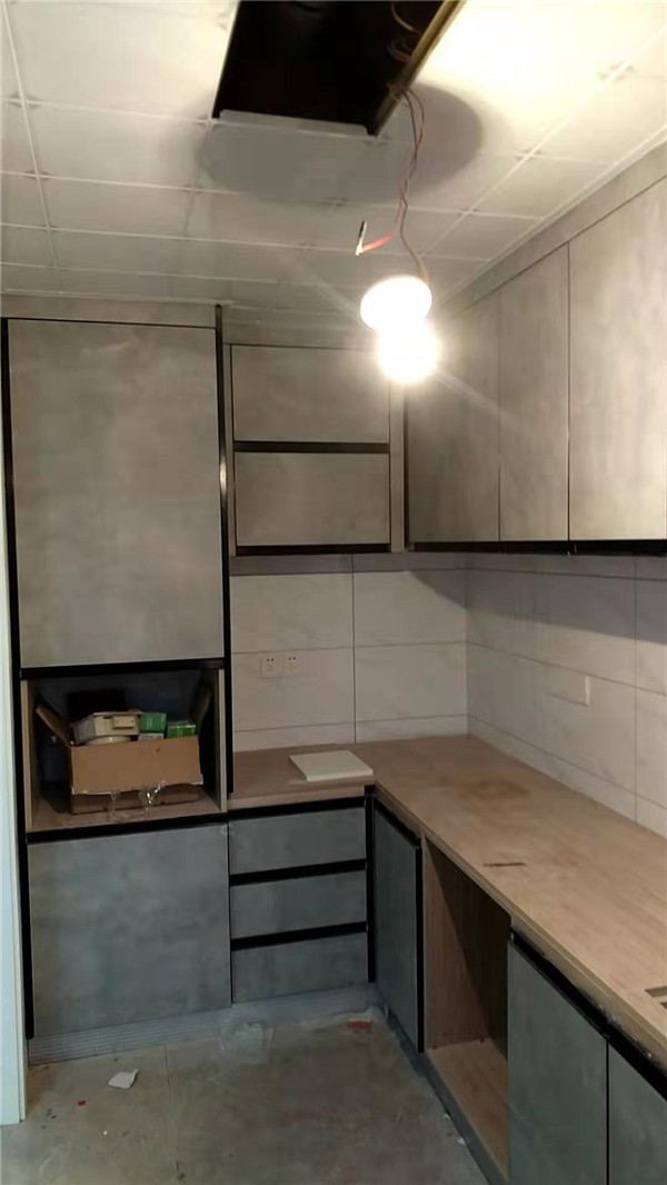 天氣比較熱,師傅們干的比較慢,門板掛好了一部分。櫥柜門板采用的是磨晶門板,