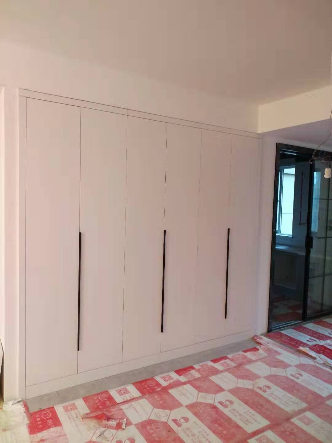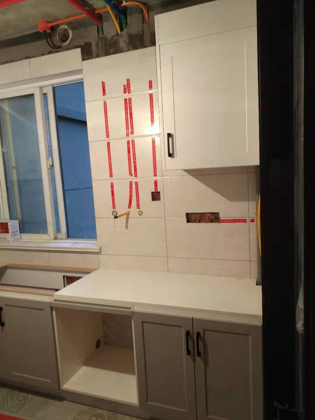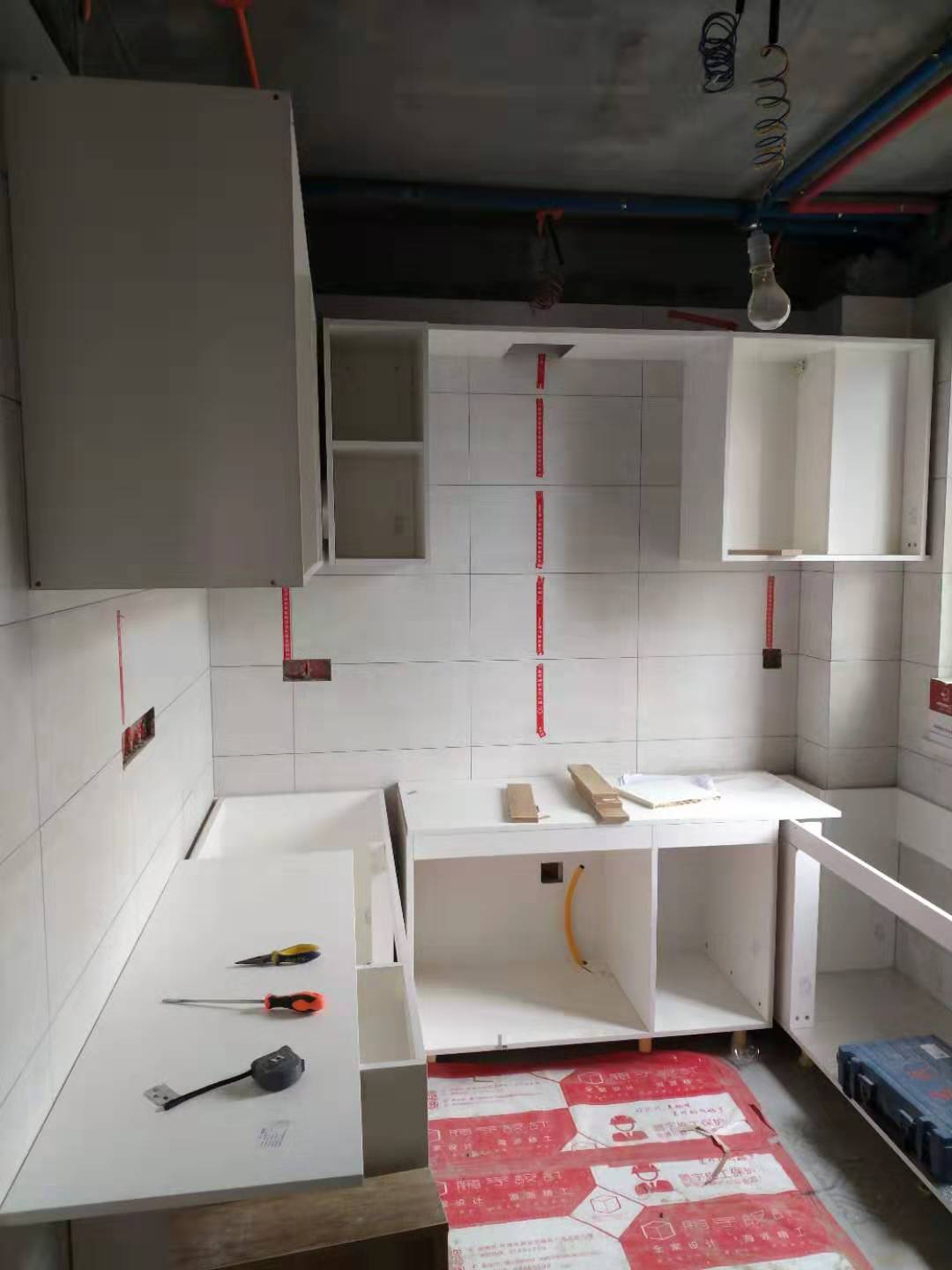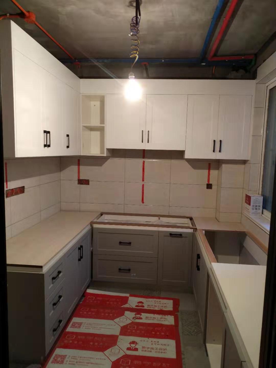 安裝進行中,五金標配:pvc雙層踢腳線、ABS尼龍柜腳、和居拉手,海蒂詩導軌、諾米鉸鏈。不得不說師傅挺給力的,大半天時間柜體裝的差不多了,點贊