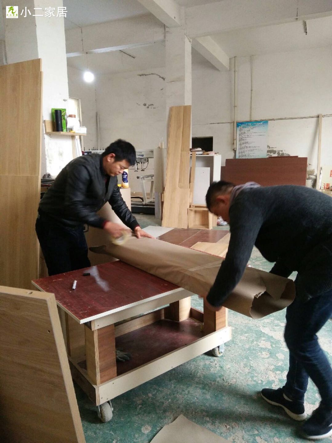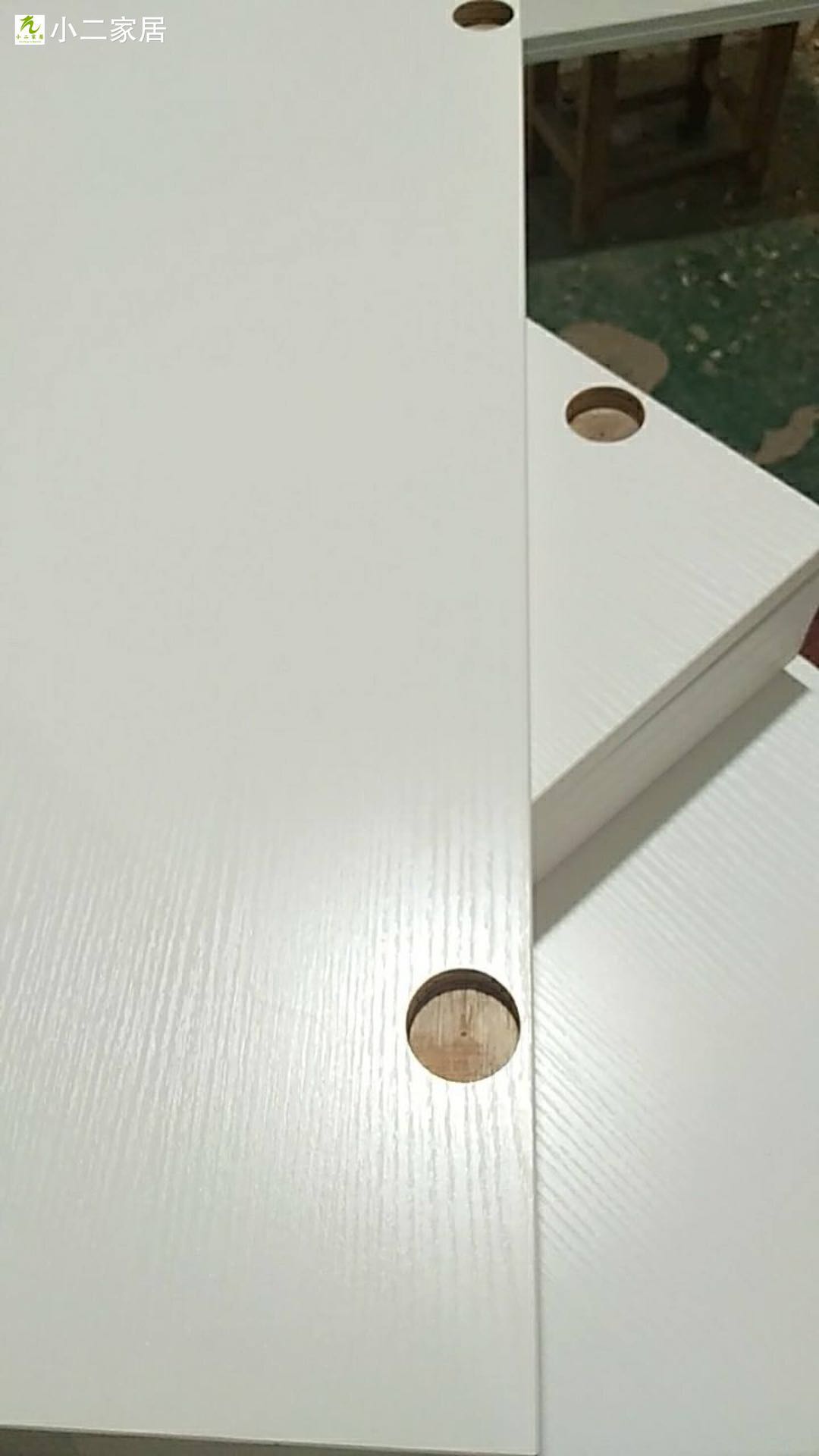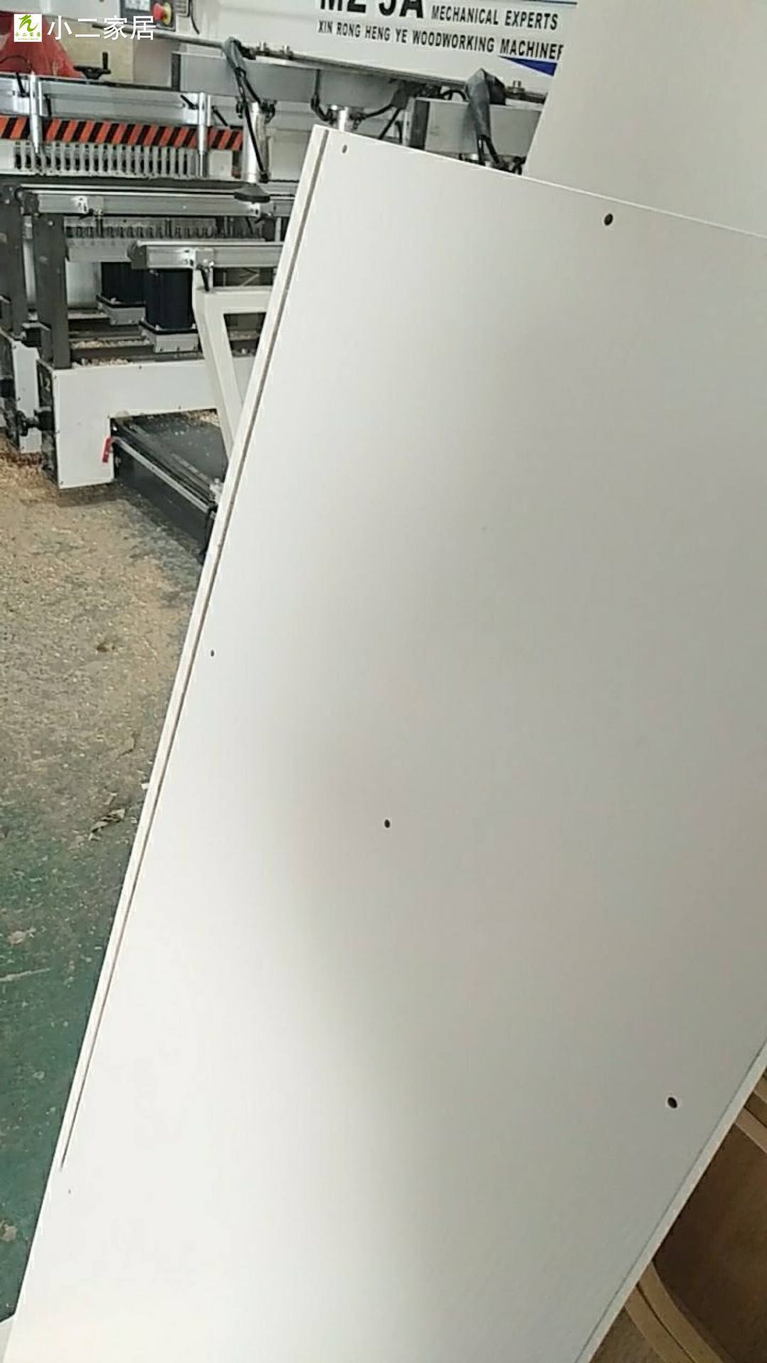開始封邊了,專業的設備封邊,沒有爆邊!使用法國波士熱熔顆粒膠,設備溫度達到200°C封邊。封邊條上有小二家居的Logo哦,齒輪傳送帶可調節,方便運輸大小不同的板材。