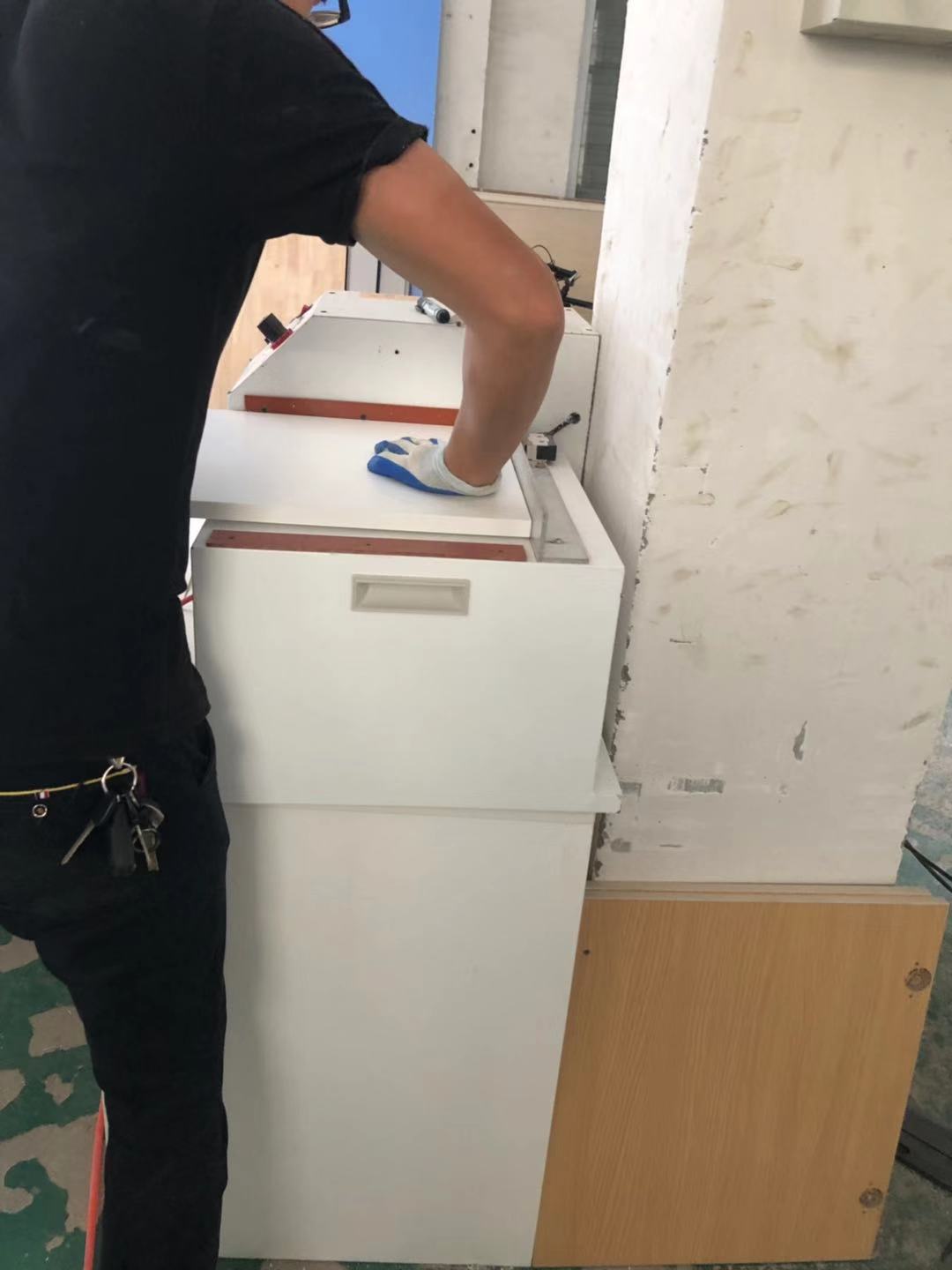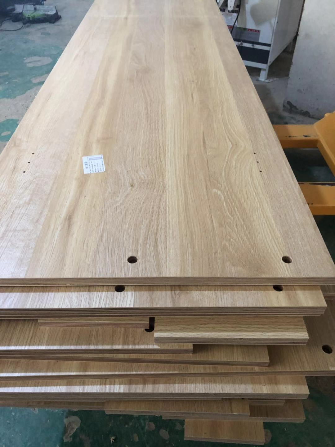 所有的柜體板已經裁完了,板材使用平安樹實木多層E清水橡木E0級制作,真材實料,有高級的藍光防偽標識,正在封邊中,封邊條上有小二家居的Logo,師傅們蠻給力的加班加點的趕生產,希望早日送到客戶家里去。