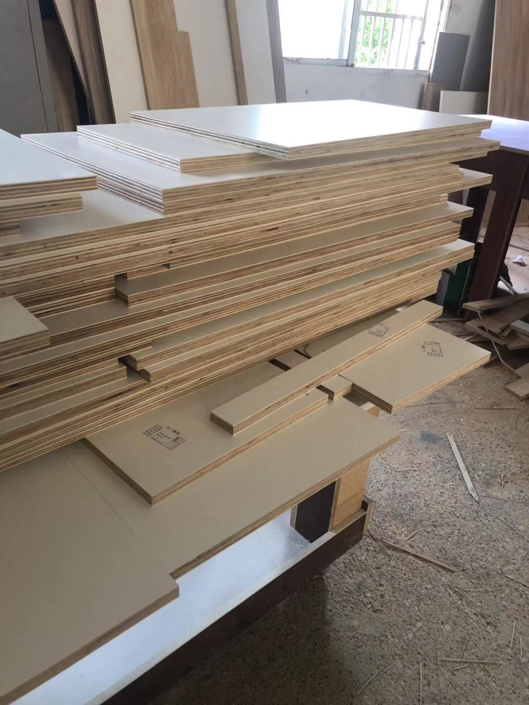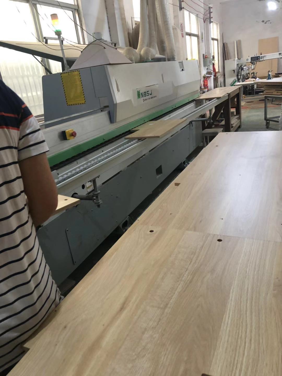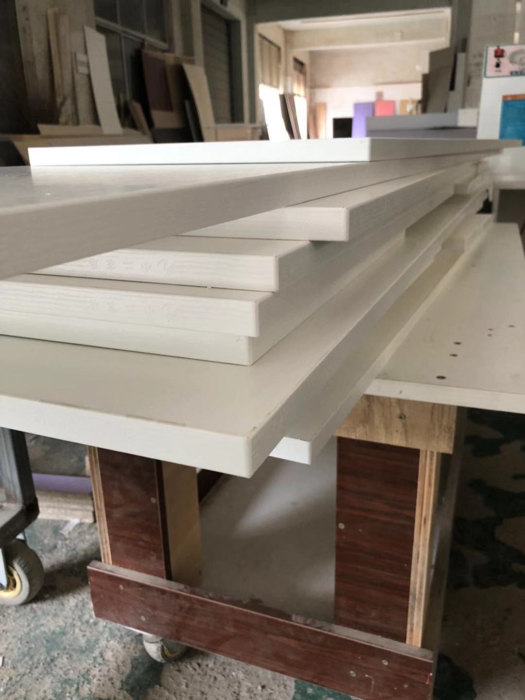 門板制作中,板材使用平安樹實木多層麻面暖白E0級制做,專業設備裁出來的板沒有爆邊!