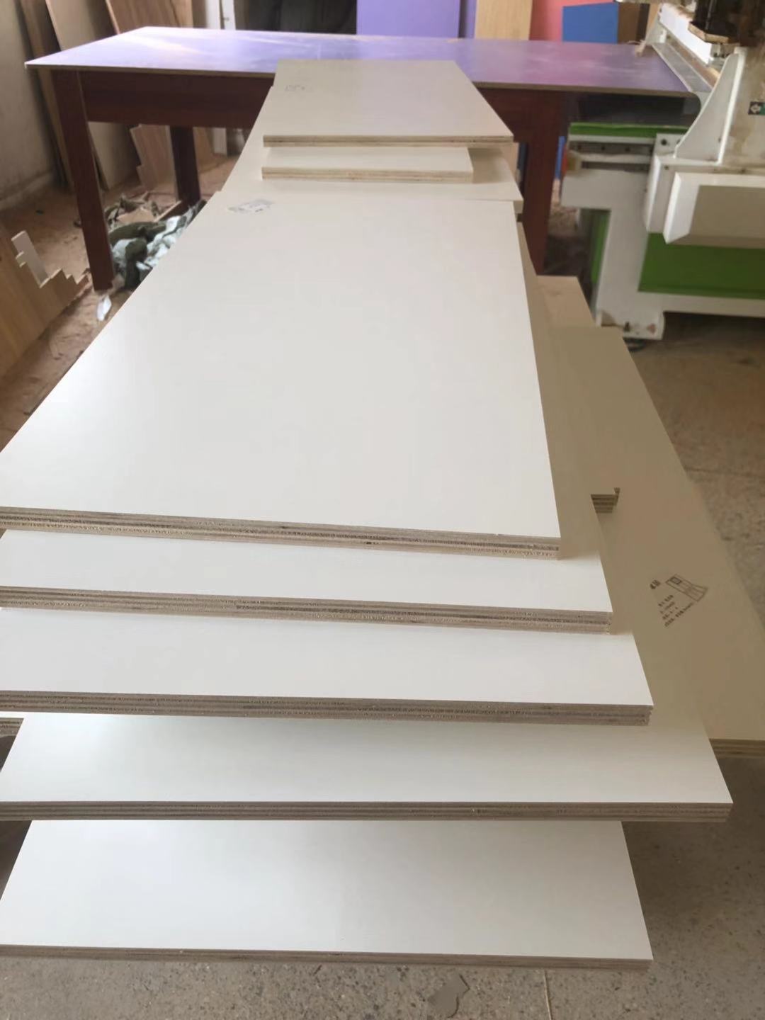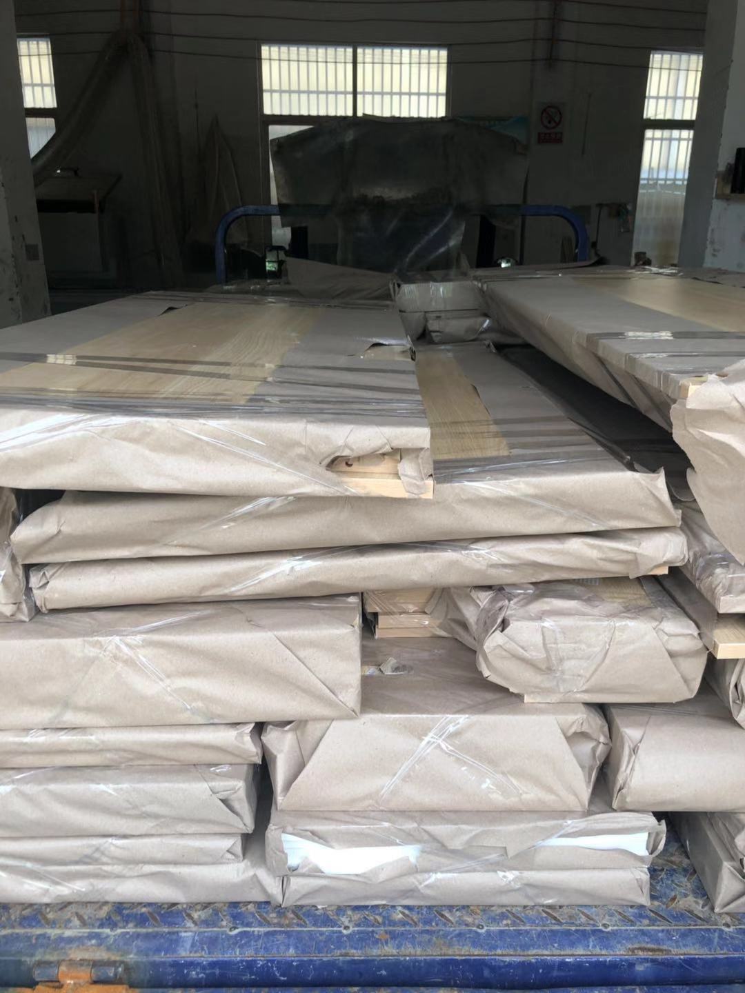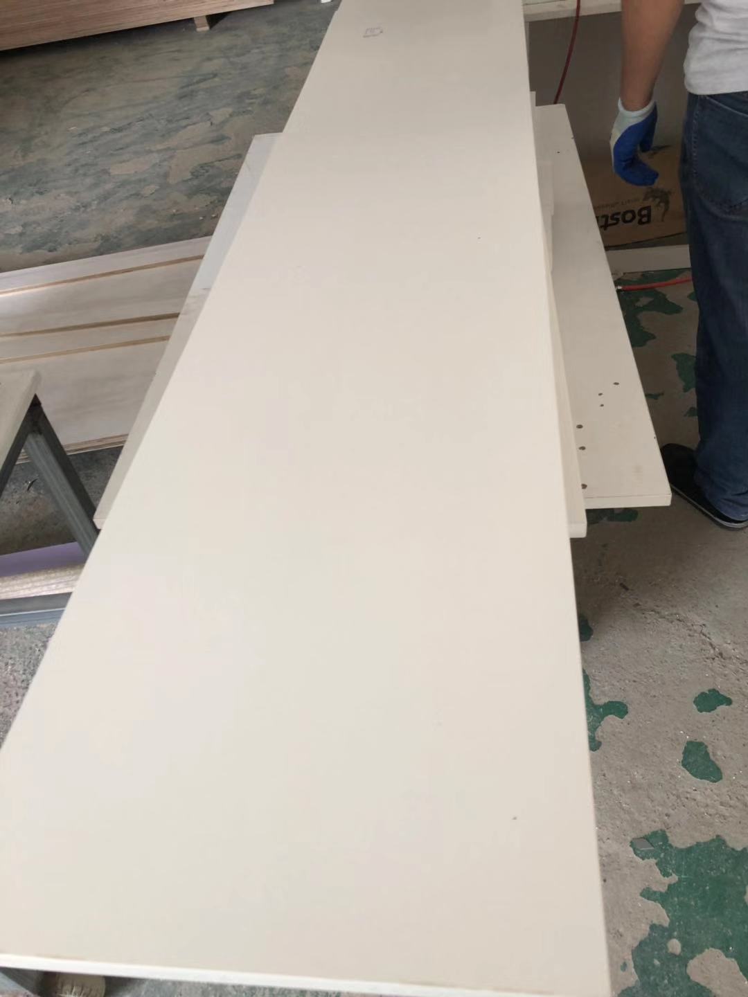 門板制作中,板材使用平安樹實木多層麻面暖白E0級制做,專業設備裁出來的板沒有爆邊!