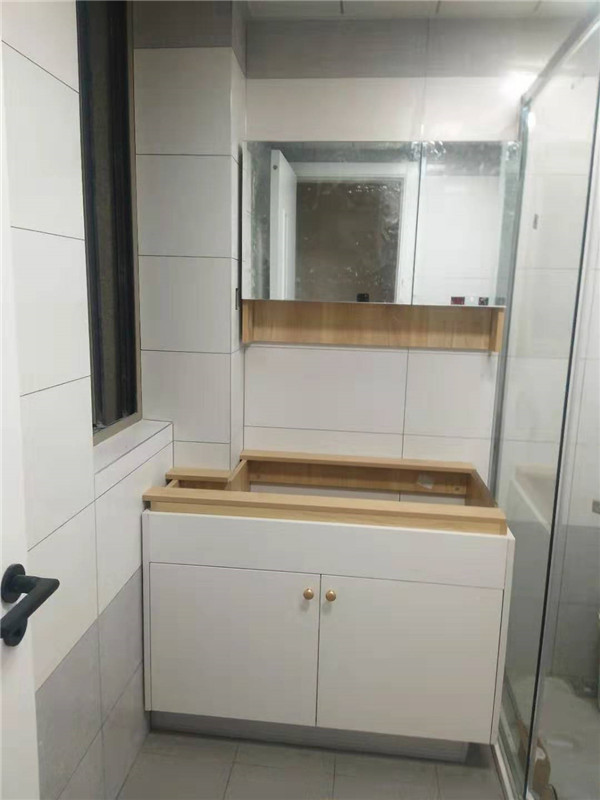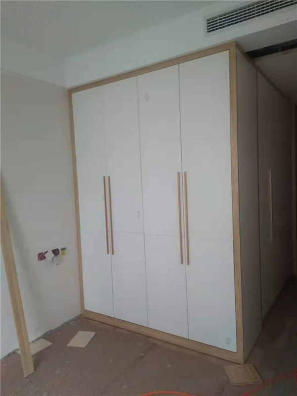 其他柜子采用的是平安樹實木多層板,一般客戶原木色配白色都會相應的搭配黑色拉手,而這個小姐姐眼光比較好,