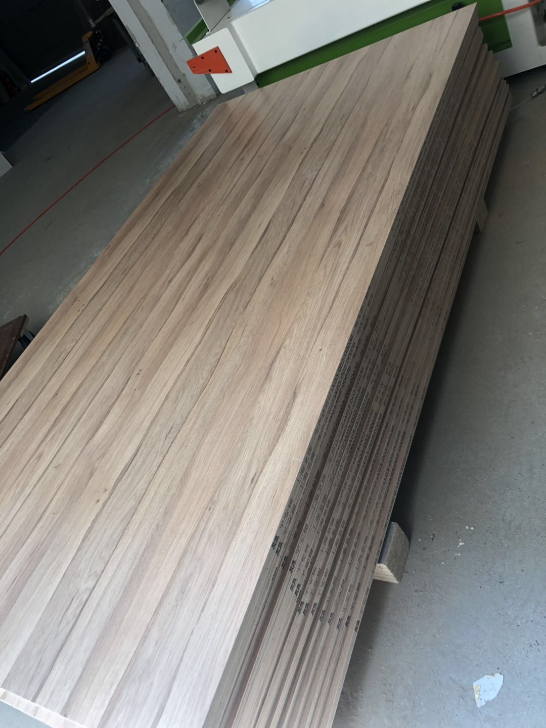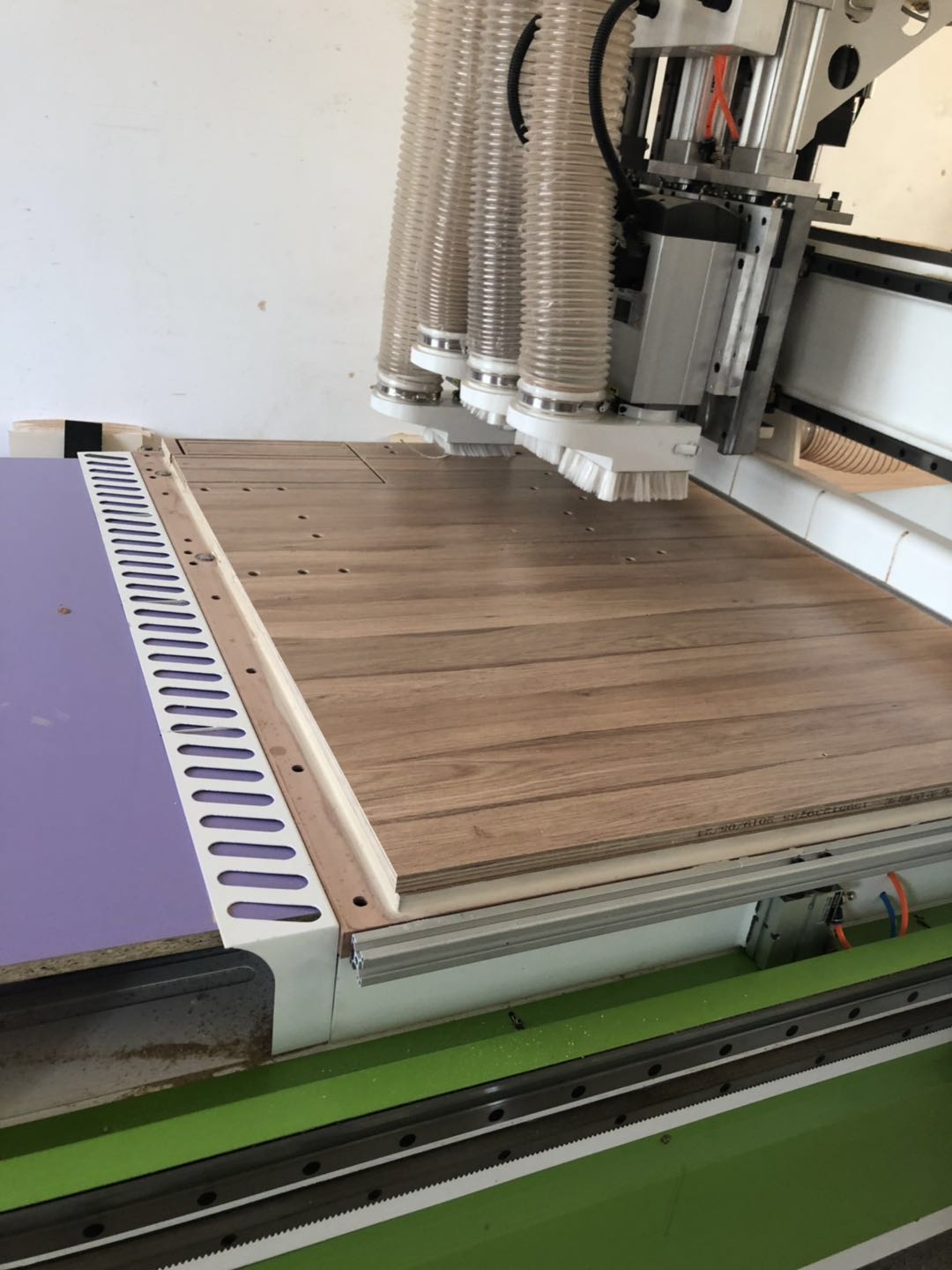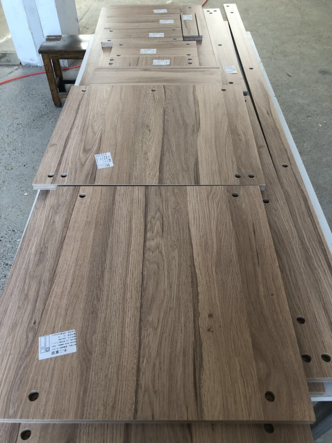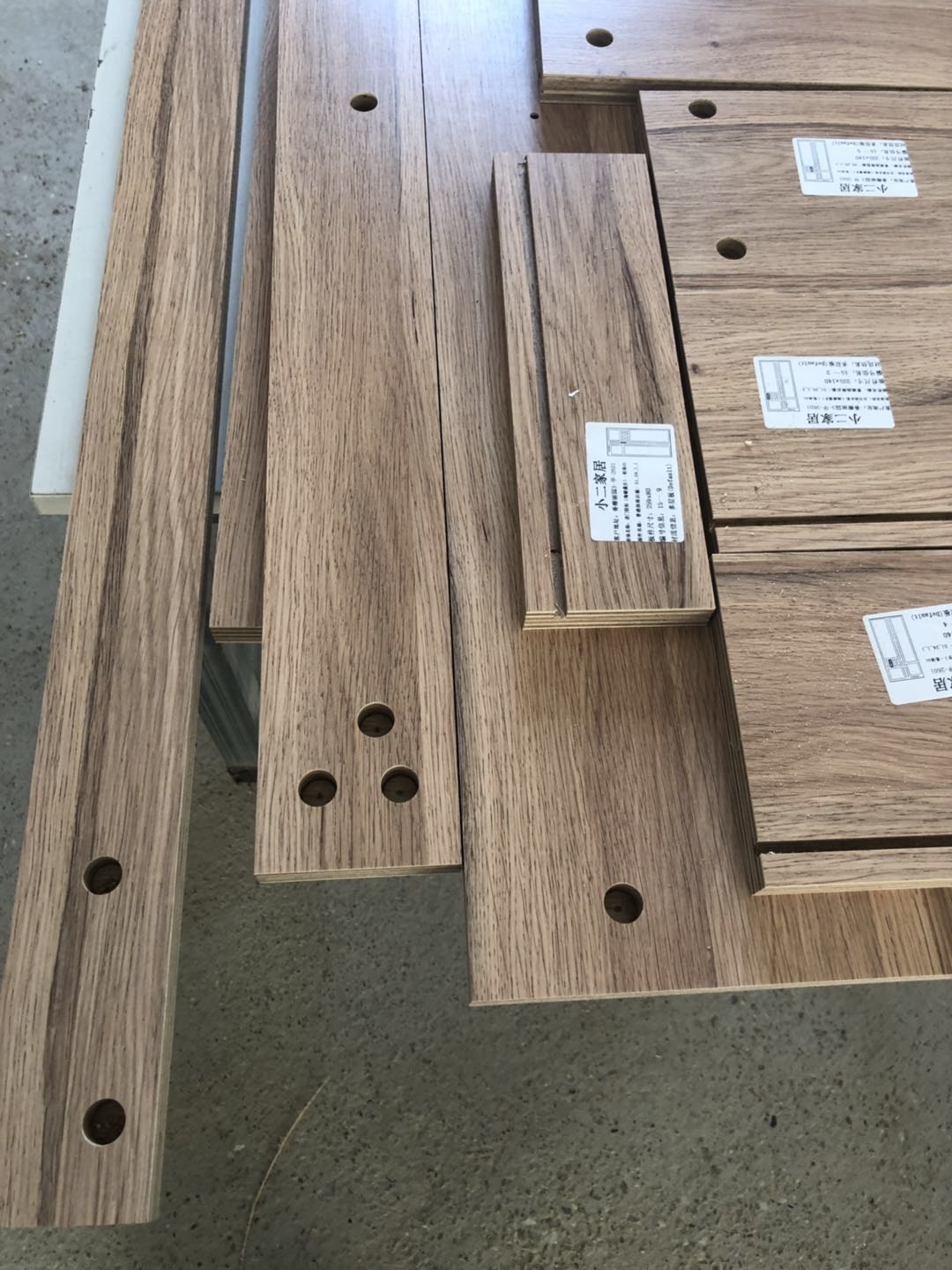 開始制作了,專業設備裁板和打孔,板材使用平安樹實木多層板制作,真材實料,有高級的藍光防偽標識。