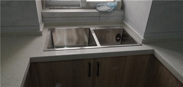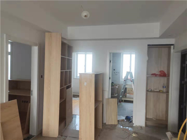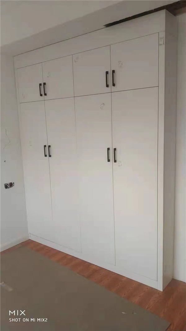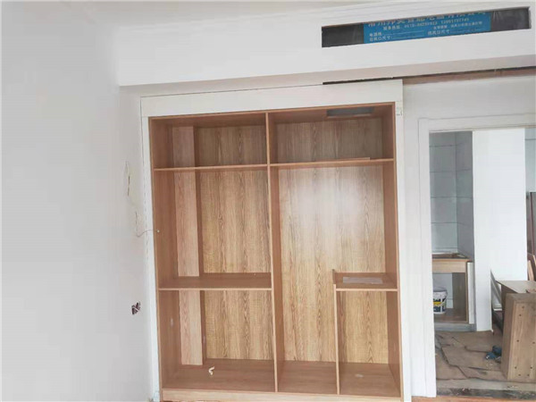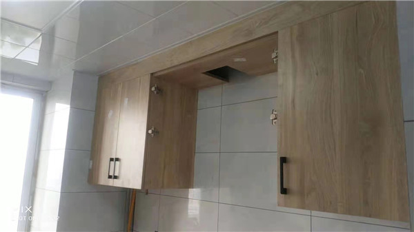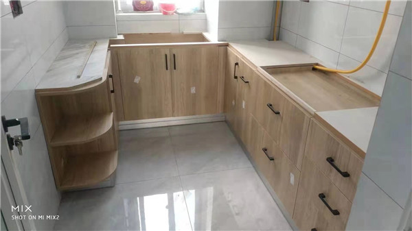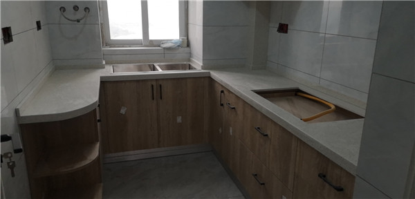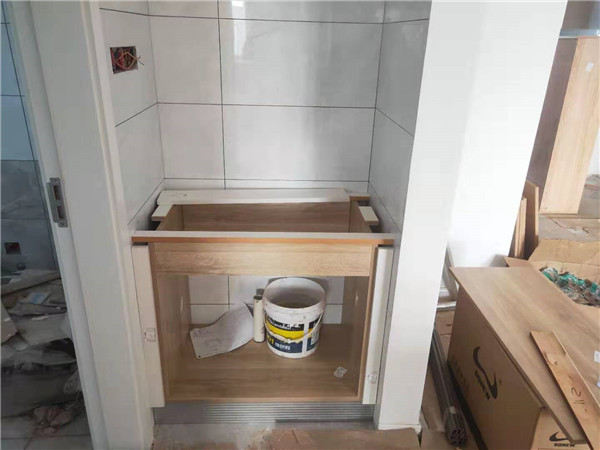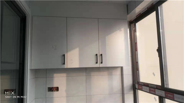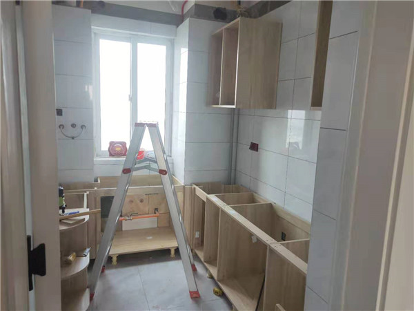 師傅們加班加點趕工,大部分已經完工。裁板由專業設備制作,沒有爆邊,更完美。櫥柜門板等為平安樹品牌,有高級的藍光防偽標識哦。