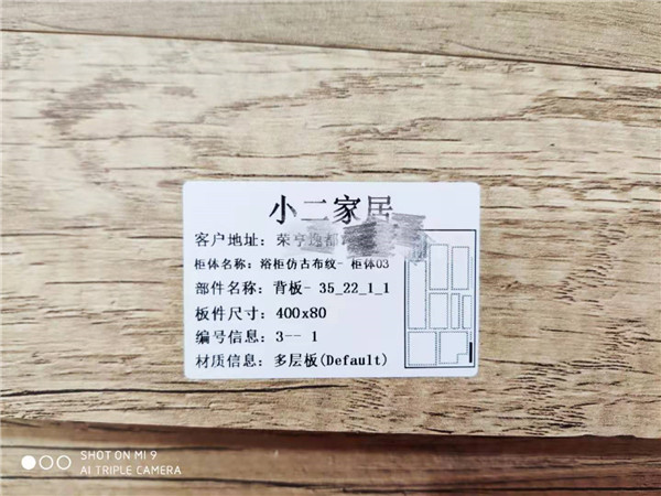 每塊板上有貼有小標簽哦方便后期安裝師傅安裝,封邊條上都帶有小二家居logo的,方便后期售后,