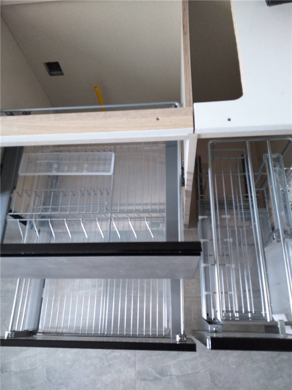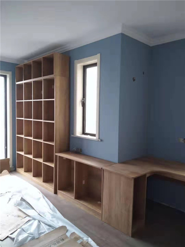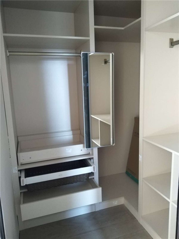 櫥柜諾米拉籃三件套,安裝師傅都保護起來啦,以防落灰導致導軌不好拉,小細節做的還是很到位的,點個贊。書桌配色很吸人眼球哦,表示很心水,衣帽間安裝了全身鏡,