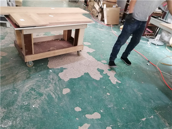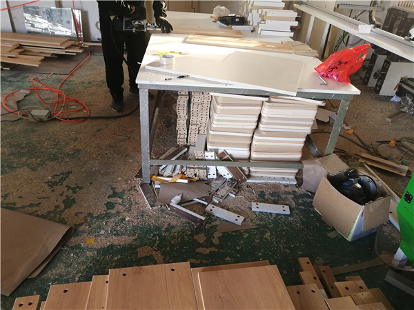 開始制作啦,柜體裁板中,專業和設備裁板,線條流暢,板材使用平安樹實木多層E0級制作,有高級的藍光防偽標識哦