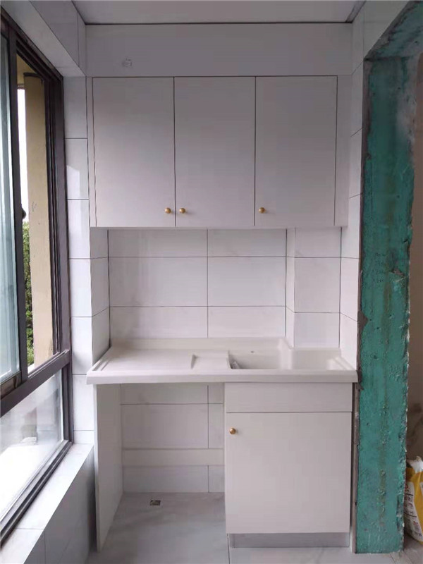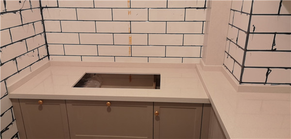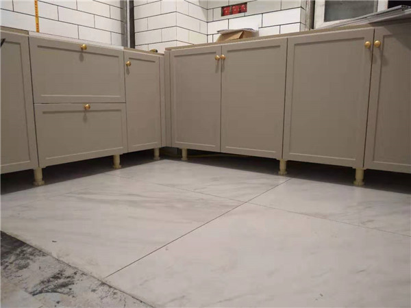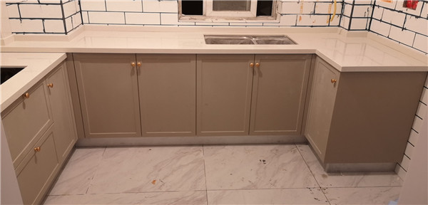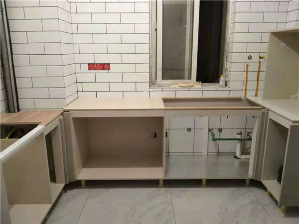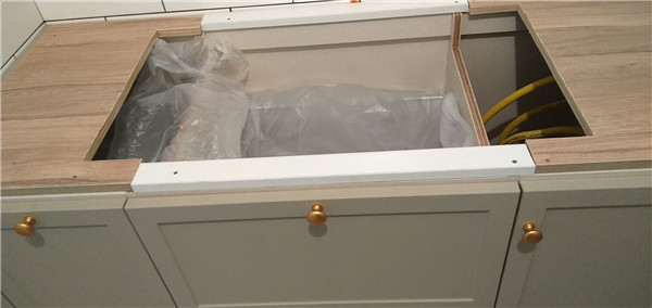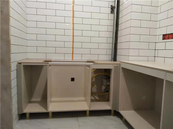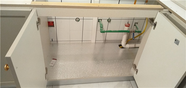再來看看廚房部分,水槽都鋪有防水錫紙,拉籃也都用塑料膜保護(hù)起來了,防止灰塵進(jìn)入影響導(dǎo)軌的拉伸。ABS尼龍柜腳和雙面踢腳線更耐用哦