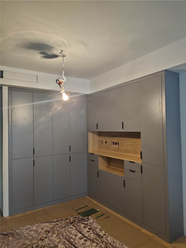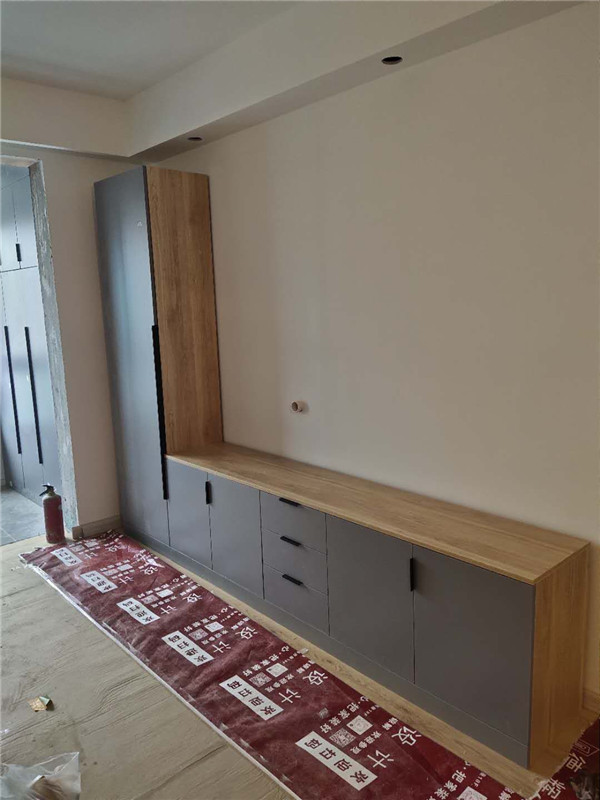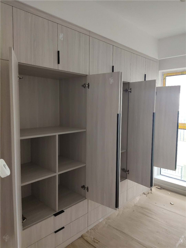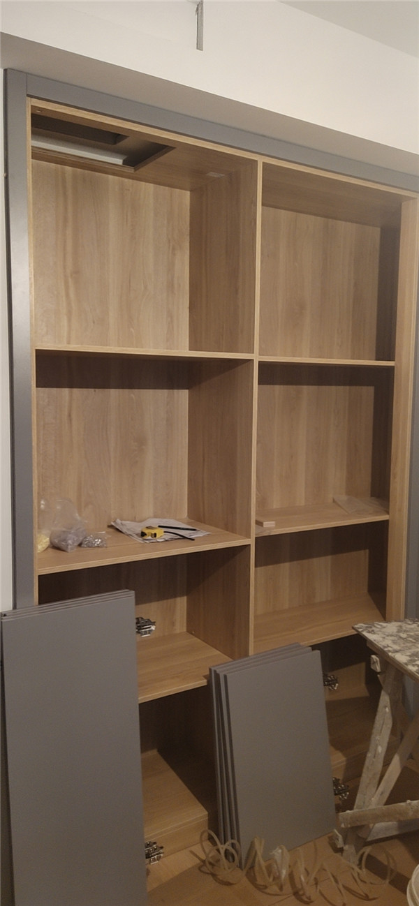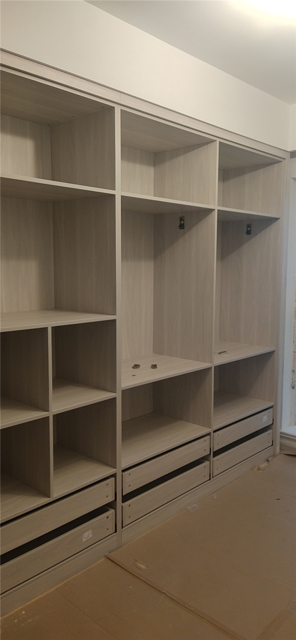 經(jīng)過幾天的努力柜體全部拼裝完畢,固定起來了。業(yè)主家柜體采用的都是淺色系,看上去清爽干凈。