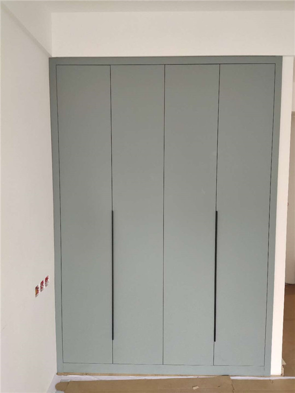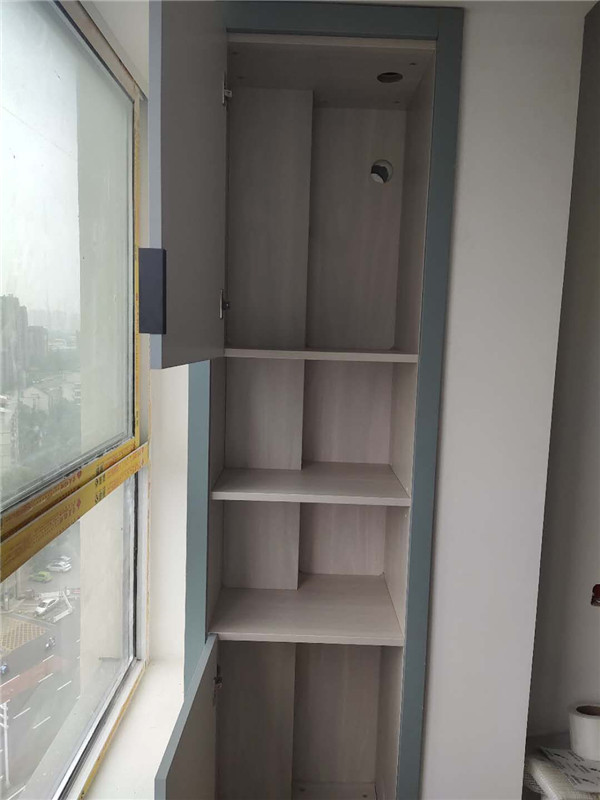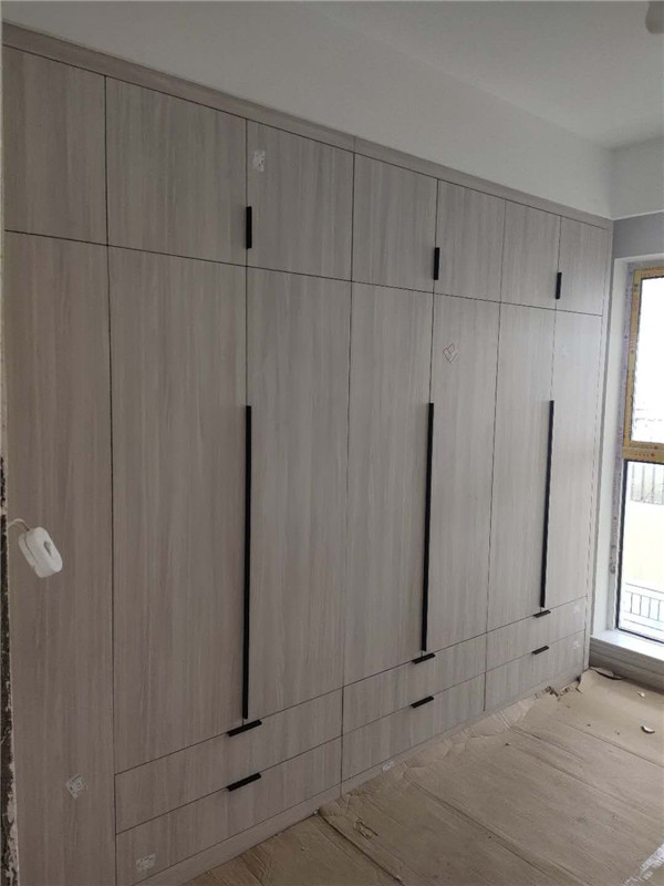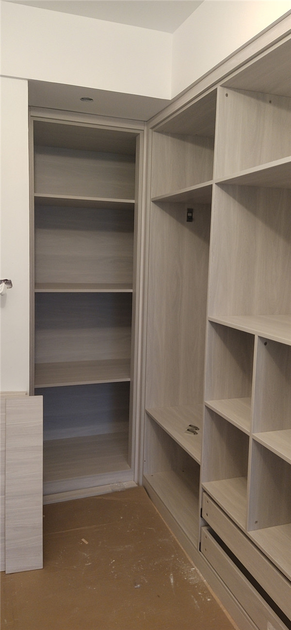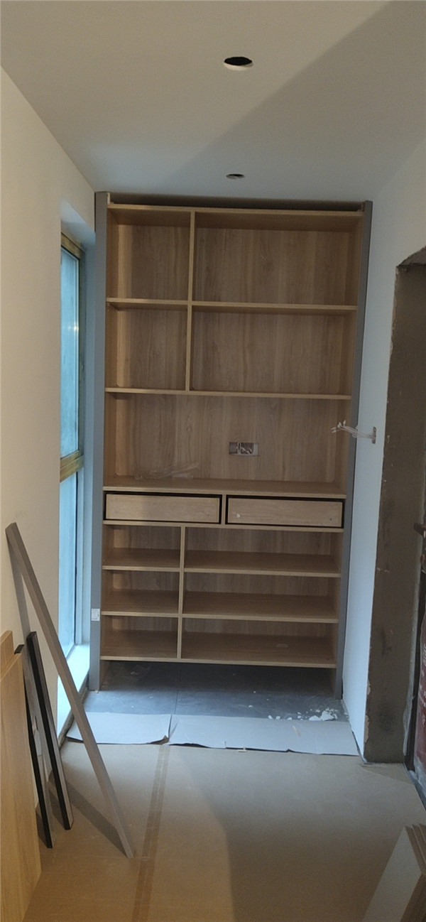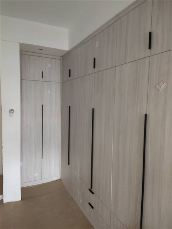 經(jīng)過幾天的努力柜體全部拼裝完畢,固定起來了。業(yè)主家柜體采用的都是淺色系,看上去清爽干凈。
