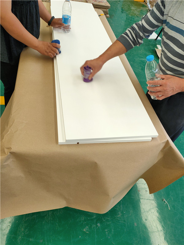 封邊完畢,已進(jìn)入打包環(huán)節(jié)。柜門師傅會(huì)用柏油清洗劑全部擦拭一遍,以保證裝到客戶家整潔美觀。