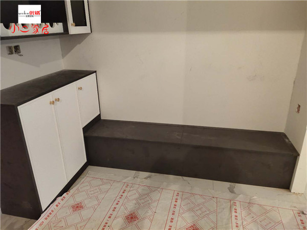 柜體基本拼裝完畢了,鞋柜卡座采用深色柜體,大氣上檔次,其他柜子采用淺色系,