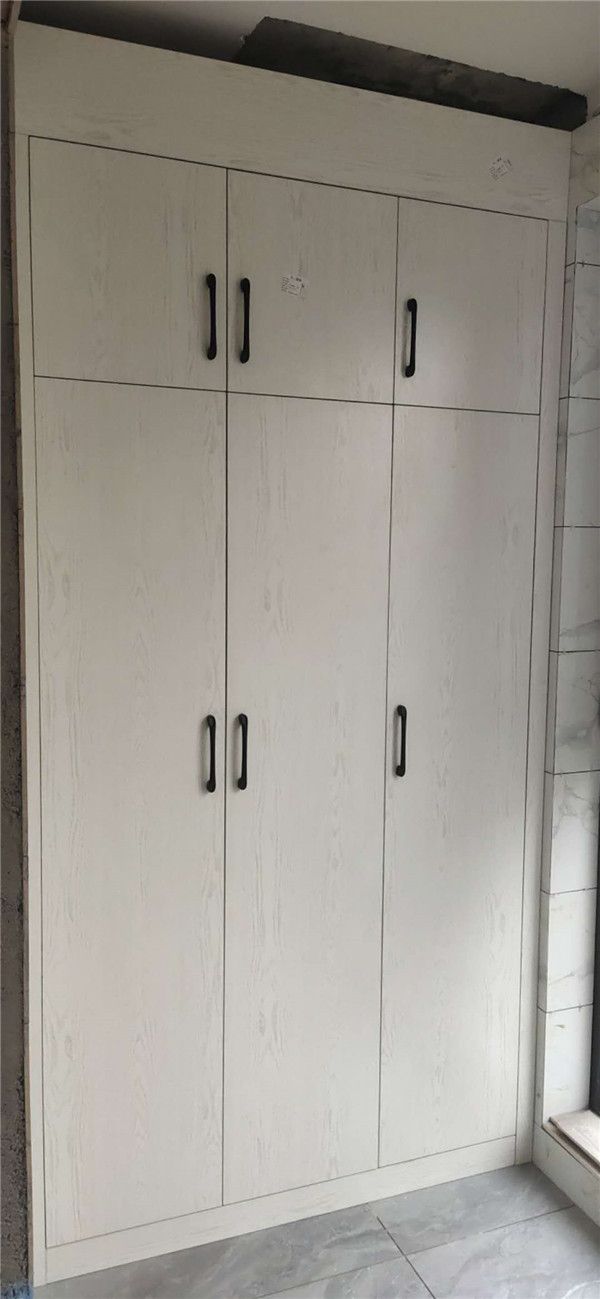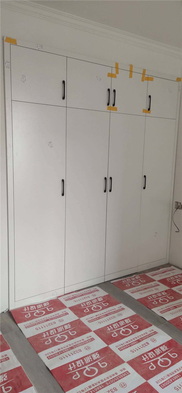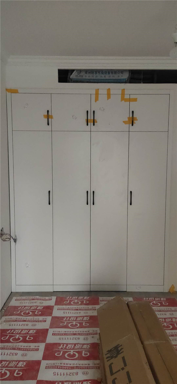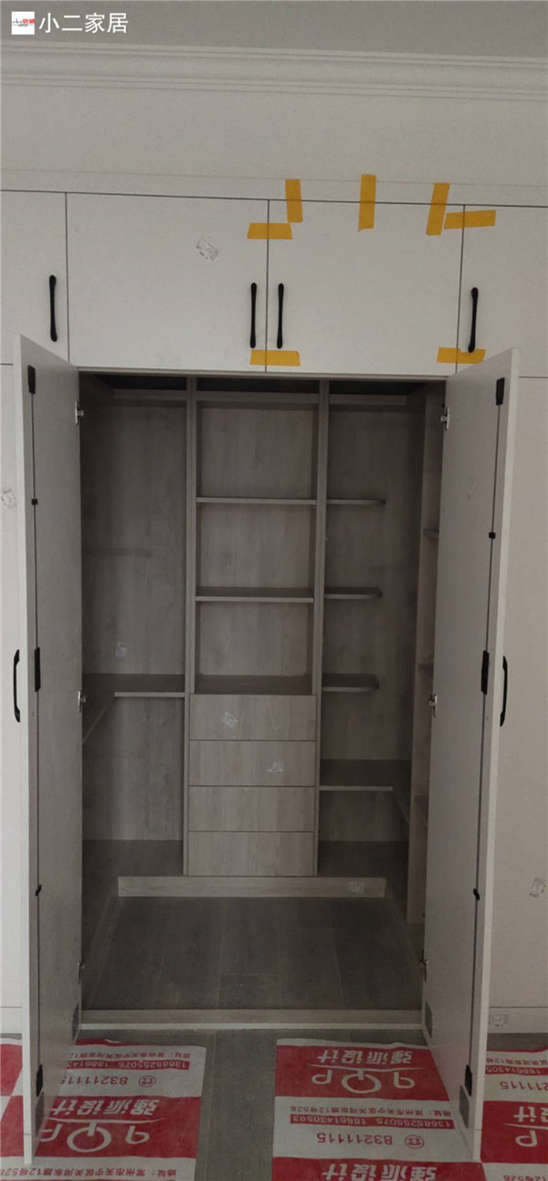 柜子全部安裝完畢啦!深色柜體白色門板在配上簡約的小拉手,整體效果簡約而不簡單。主臥看似是個普通的衣柜,其實是一個步入室的衣帽間,哈哈,是不是很意外,我也很意外,大大的衣帽間收納足足的了。